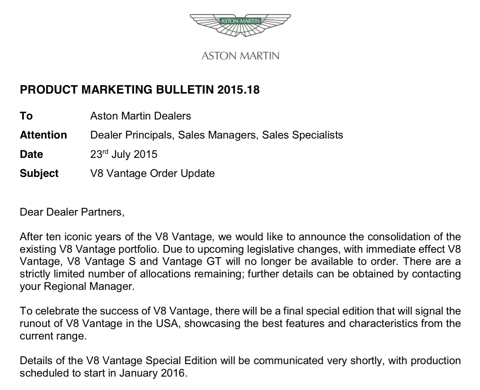 Well, maybe it is related to the side impacts issue, and they can only sell a limited (by NHTSA) number of Vantages here in the USA. That might explain why this doesn't apply to Europe and why they are making it a special edition (at a high price I would guess) to up as much content as they can on those few chassis they are allowed to sell?