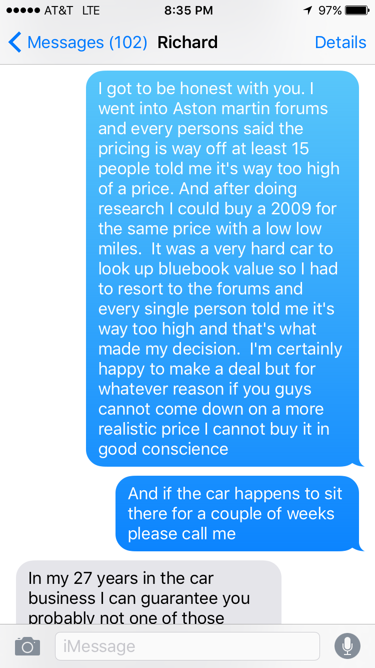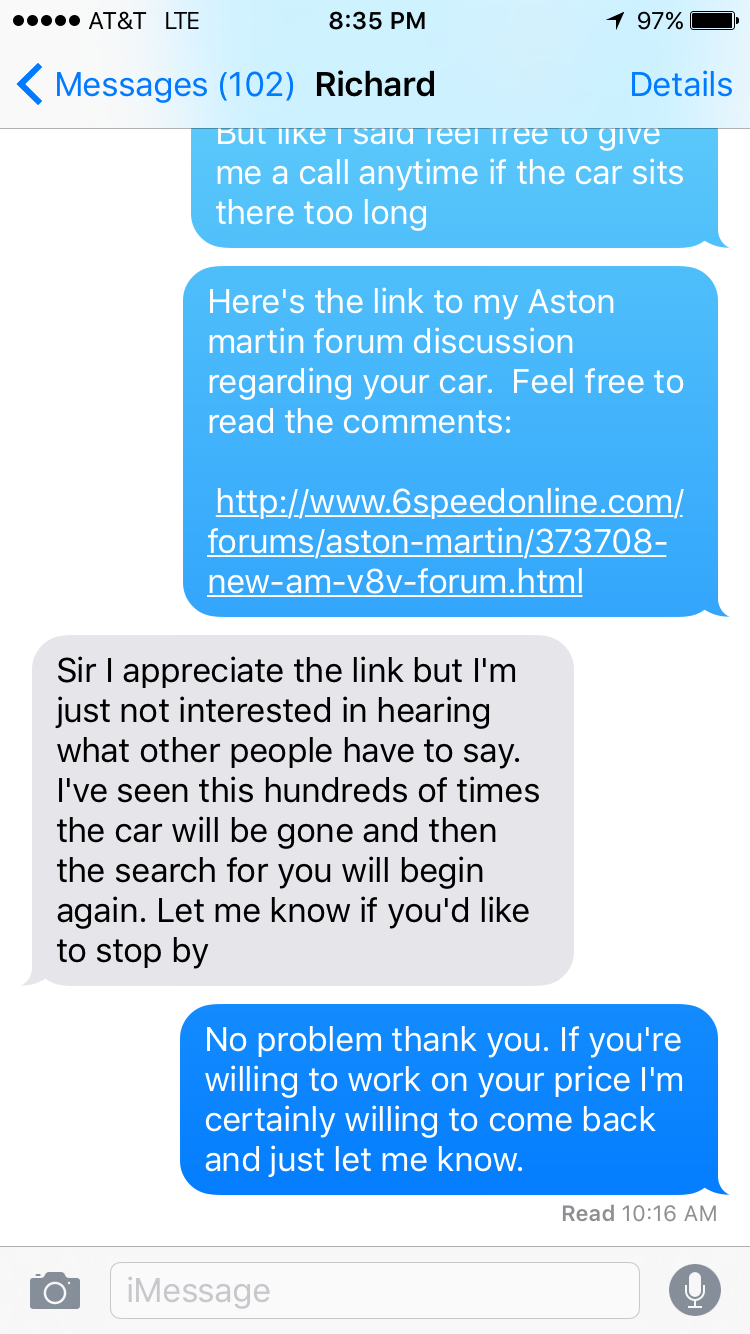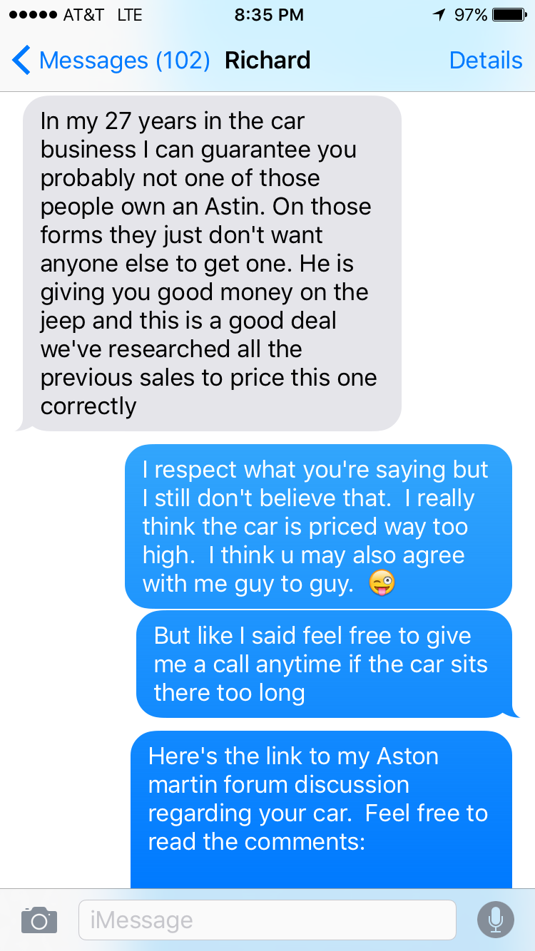 OMG you guys! I had to post the dealers text response after I questioned his pricing on that 2006 AM V8V I was looking at for $60k! (see my OP). If this doesn't tell you what a sleeze ball this guy is I don't know what does! Thank Gawd I came to my senses and asked for you're input on this forum before I made a huge mistake! Here's the link to the V8V I was going to purchase and also the conversation below: http://www.jaguarchantilly.com/inven...d=0&MakeID=588