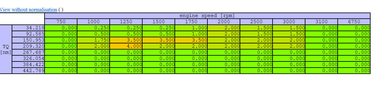 Here is the base EGR table in a US '07 AMV8. Gives %cylinder mass from exhaust based on RPM and driver TQ request. There are table mods for variable cam, coolant temp, intake temp, outside temp, startup delay etc. The PCM has a flow model based on the Differential Pressure Feedback EGR (DPFE) sensor so it can accurately control % combusted via Electronic Vacuum Regulator (EVR) which controls the vacuum driven EGR valve