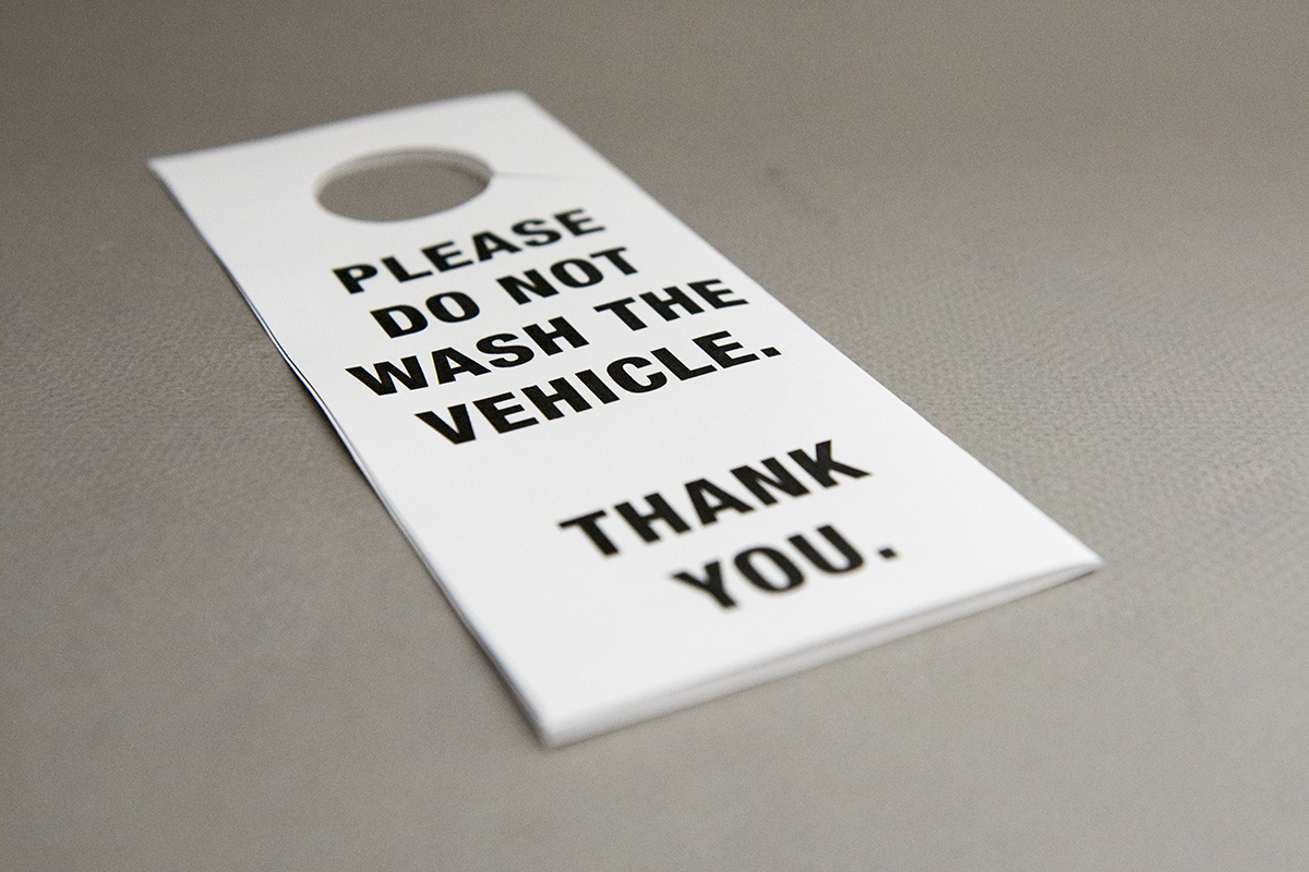 I'm dropping the car off at the dealership tomorrow morning for service. I really wish the dealership would do a better job washing cars but they don't. So to prevent them from putting swirl marks on the paint and undoing all the work I did, I printed out a custom hang tag for the rear view mirror. Do you think my OCD is acting up?