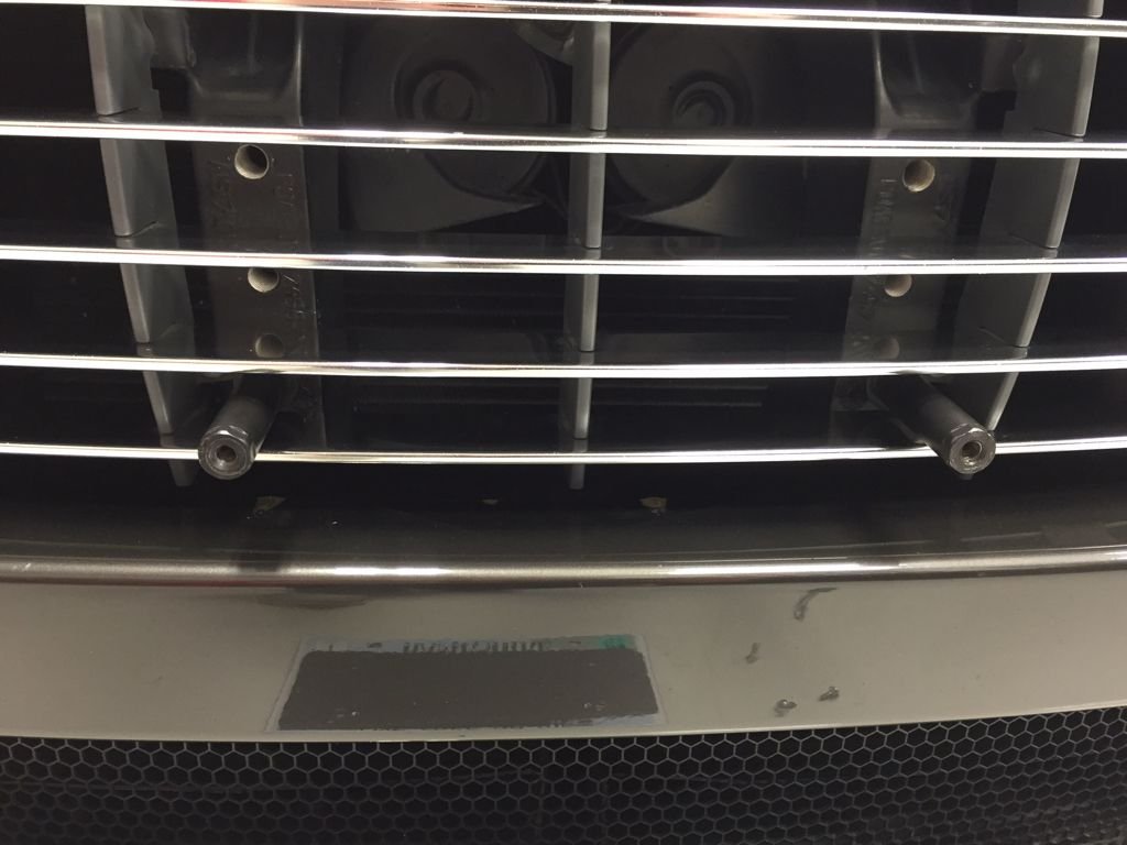 I etch primed the posts, painted them flat black and mounted them into the bottom set of grill holes. I used some nylon spacers to get the front of the posts to overhang the bumper by about 1/8":