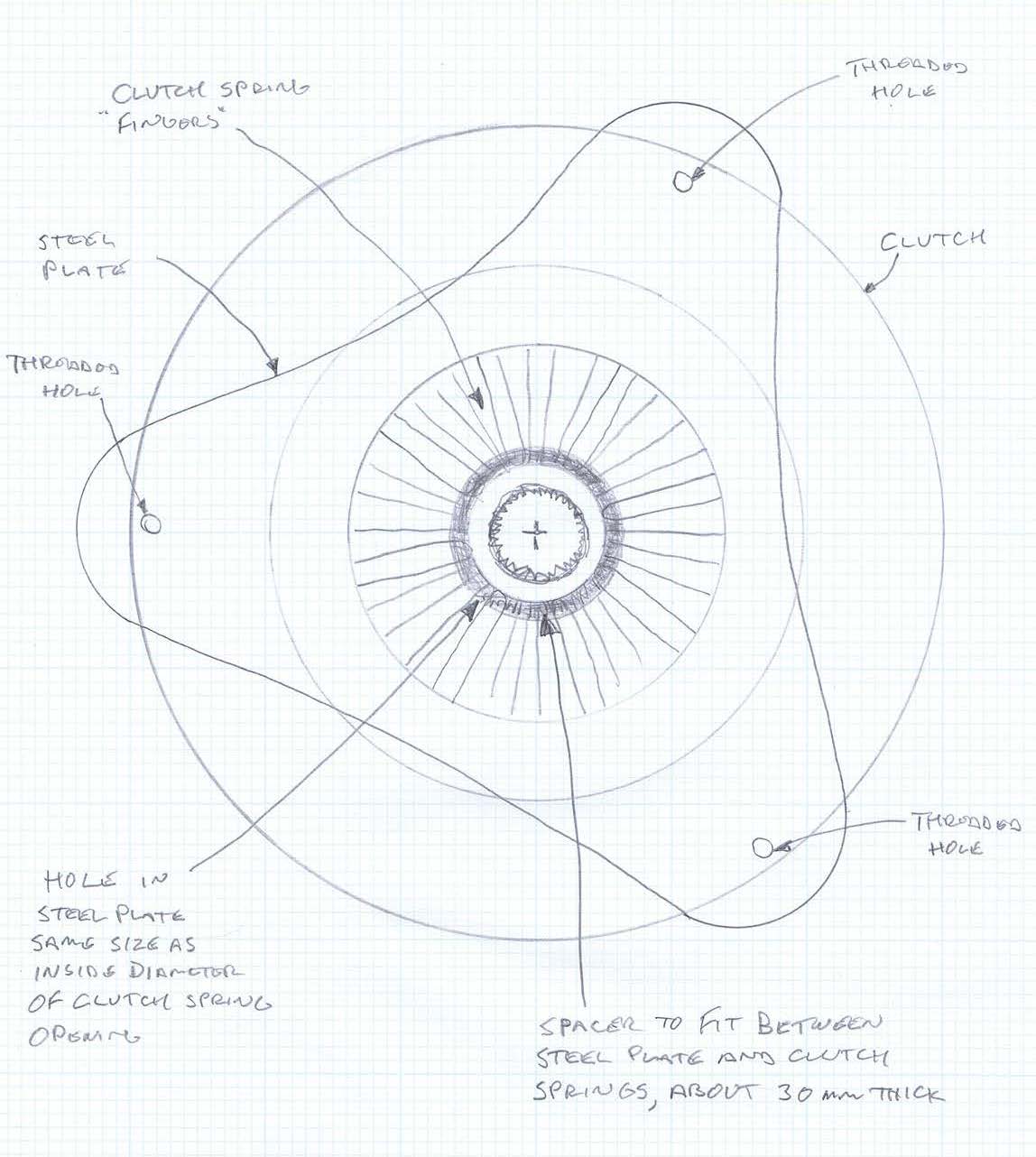 That is a simple enough tool to fabricate. Thanks for the sketch. Instead of the center hand nut on the factory tool you used the 3 bolts to gradually compress the clutch springs. I will add a pilot on the triangular steel tool so the cylindrical spacer stays in place easily.