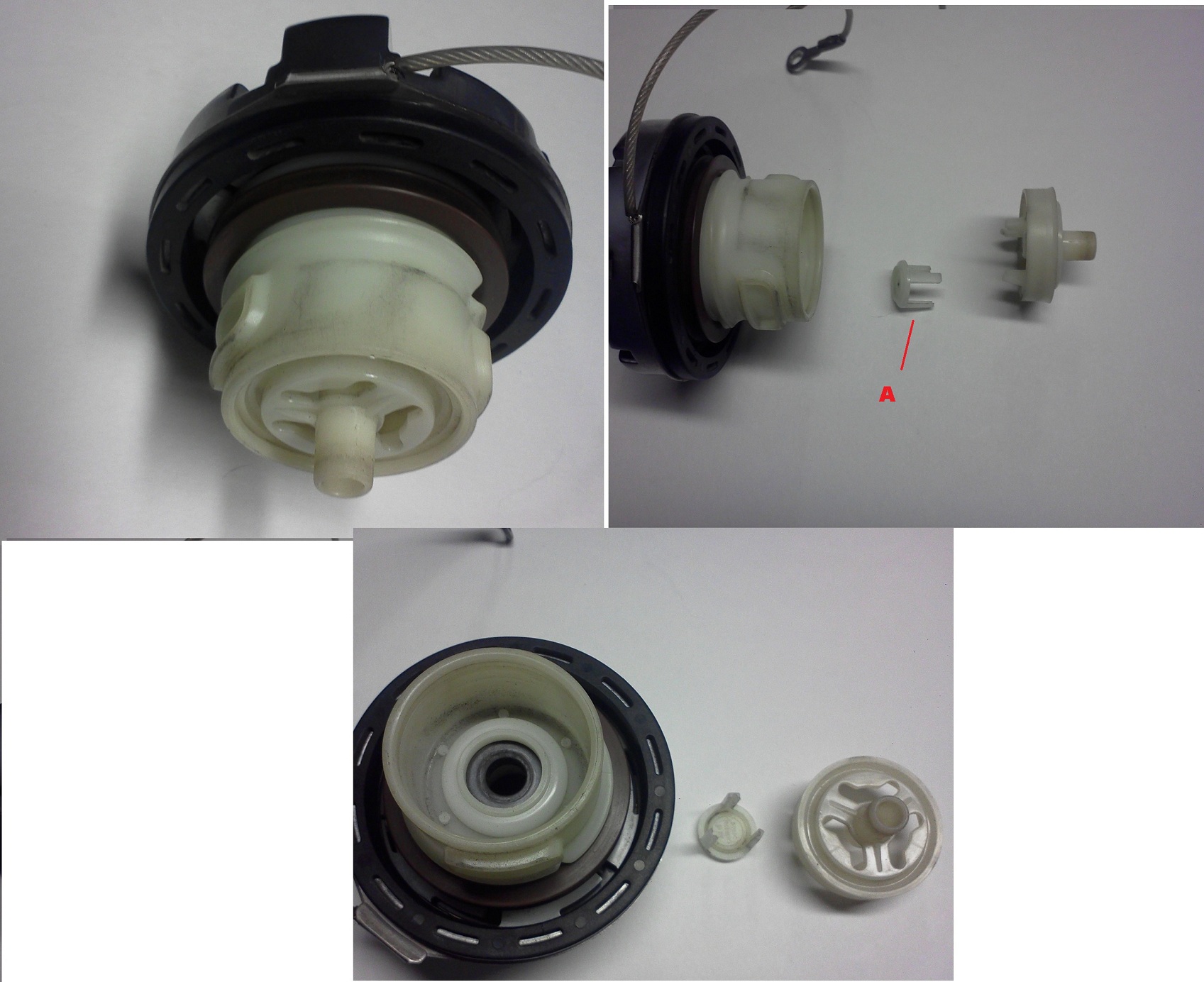 trying to figure out if a P0442 code that has triggered lately is gas cap related before shelling out big bucks for a new one. , i just remembered about a month ago when i was filling up,with gas, with cap in its hole on the filler cover,when pulling cap from hole it came apart and left the spigot part in the cover hole,in the pics below here is what i put back together.part A sits on top of a rubber seal and the spigot part snaps back in the cap body, after lots of searching the web it was mentioned something about a spring came out also ???. anyone know if i am missing a spring, Also there is a gas cap service kit 4G43-68-10936 available, anyone know whats in the kit.. any info would be greatly appreciated..