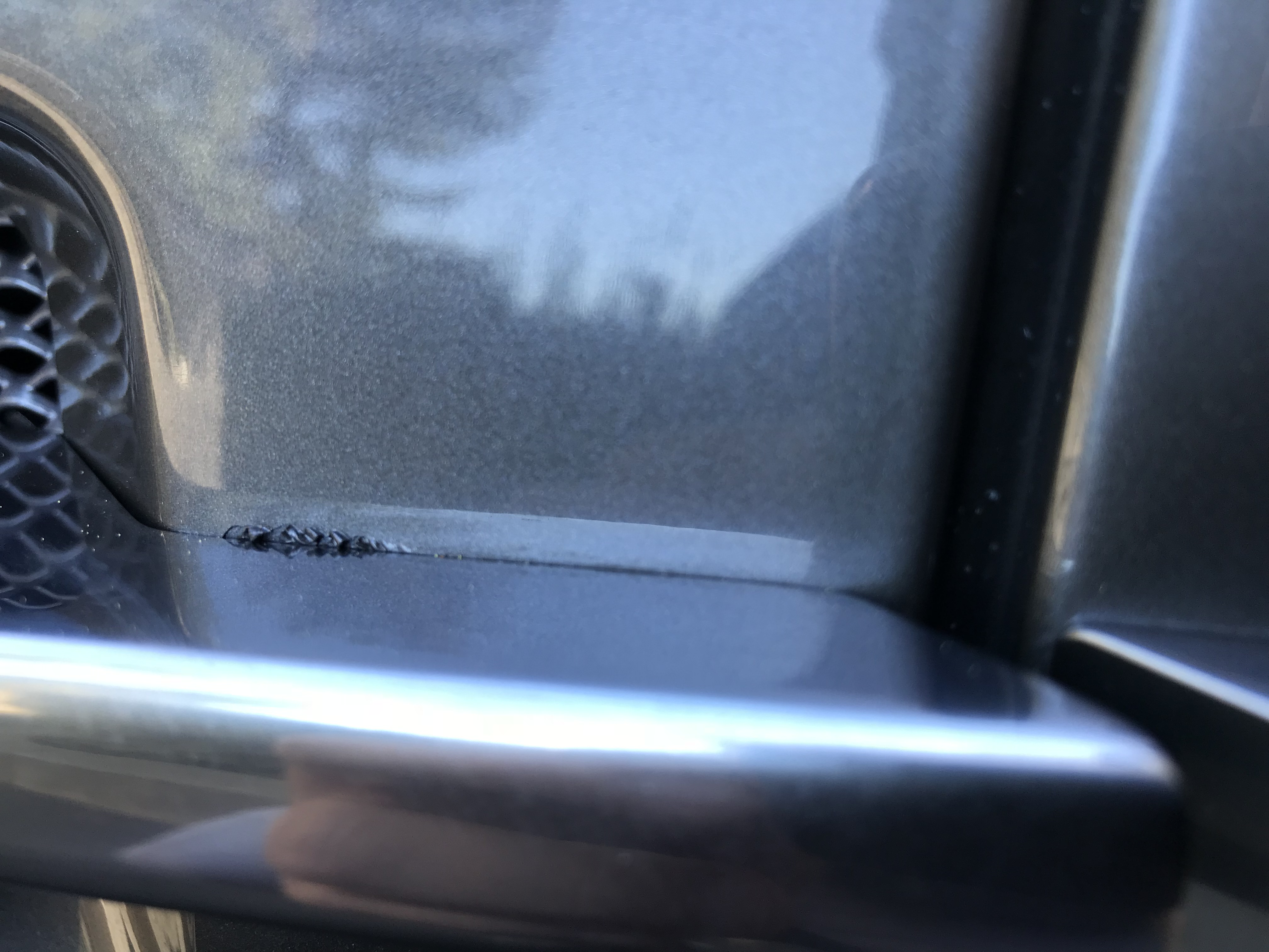 Looks like they didn't let the paint cure properly before installing the side grills and the edge dug into the paint during the curing process... now small vibrations or movement is causing the bubbling paint... only solution is to respray the panel...i wouldn't try to blend light metallic
