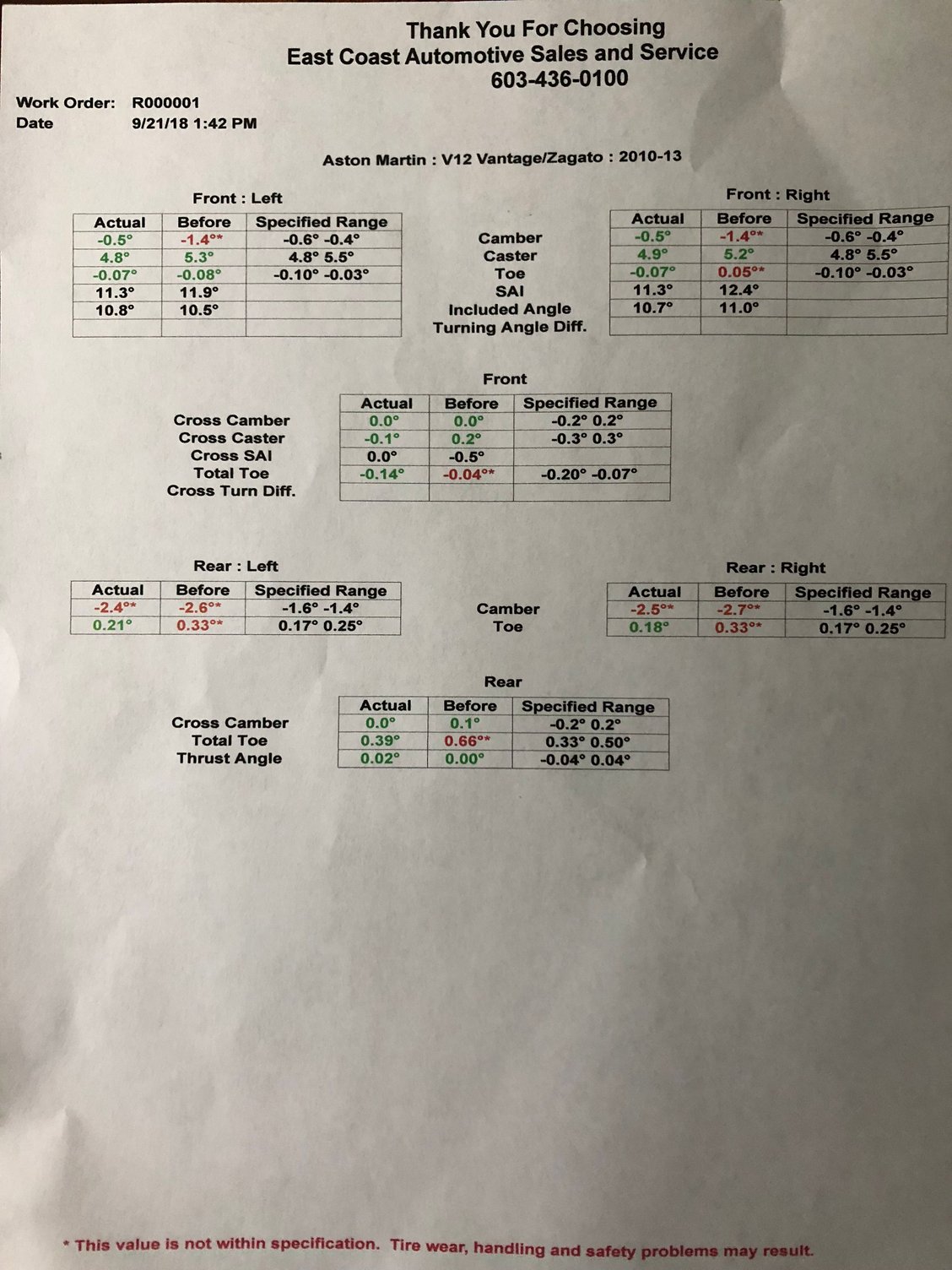 Had the car aligned today. Posting the alignment results below for completeness. I've put 50 or so miles on the car since installing the springs and getting it aligned; final drop measurements are as follows; measured from ground across center of wheel to fender lip on level surface (garage floor):