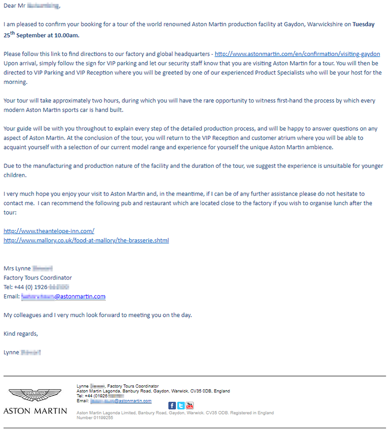 I received the confirmation email from Aston Martin today. I am booked to go on the Aston Martin Factory Tour in Gaydon on the 25th of September. If you've been there, can you please recommend places to see, things to do, restaurants to hit up, etc.? I'm already planning on checking out Oxford, the Cotswalds, and Warwick Castle but I'd appreciate your suggestions. Thanks!