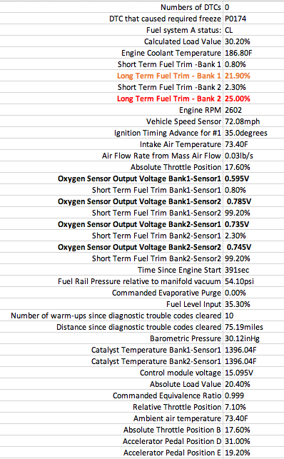 In both cases the code triggered, and as validated above, I was on the highway cruising with light throttle input. Notice the Long Term fuel trims for both banks are too high! In this case, Bank2 is higher by just slightly, but high enough to trigger Bank2 code (P0174)--presumably when LTFT hits 25%, it will trigger a lean code. Even though it didn't trigger a P0171 (Bank1 lean), clearly the bank1 LTFT is also too high. Based on all my research, combined (total) short and long term fuel trims for each bank should be +/- 5%. In this case, I'm exceeding 25% on bank2 and well over 20% on bank1. At idle, my short and long term fuel trims are hovering around +/- 5%--which appears to be normal. So that rules out a vacuum leak.