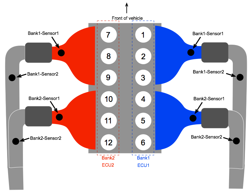 I'm confused to the "Bank" nomenclature with OBD2 in a dual ECU vehicle. In trying to narrow down my issue, I want to make sure I'm looking at the right PIDs. P0174 is Bank2, so is this the left side (Drivers side in USA), rear 3 bank of cylinders or the entire left bank of 6 cylinders? When choosing PIDs to data log, I assume connecting to ECU2 will show me all data on left (drivers side) bank of cylinders? And if this is true, Bank1-Sensor1 and Bank2-Sensor1 are both primary (pre-cat) O2 sensors on the drivers side manifold? If so, this would mean the secondary (post-cat) O2 sensors would be Bank1-Sensor2 and Bank2-Sensor2...Do I have this right? If I connected the OBD2 scanner to ECU1, the exact same nomenclature above applies for Bank1 (passenger) side of the engine, correct? In this case, perhaps a picture is worth a thousand words: