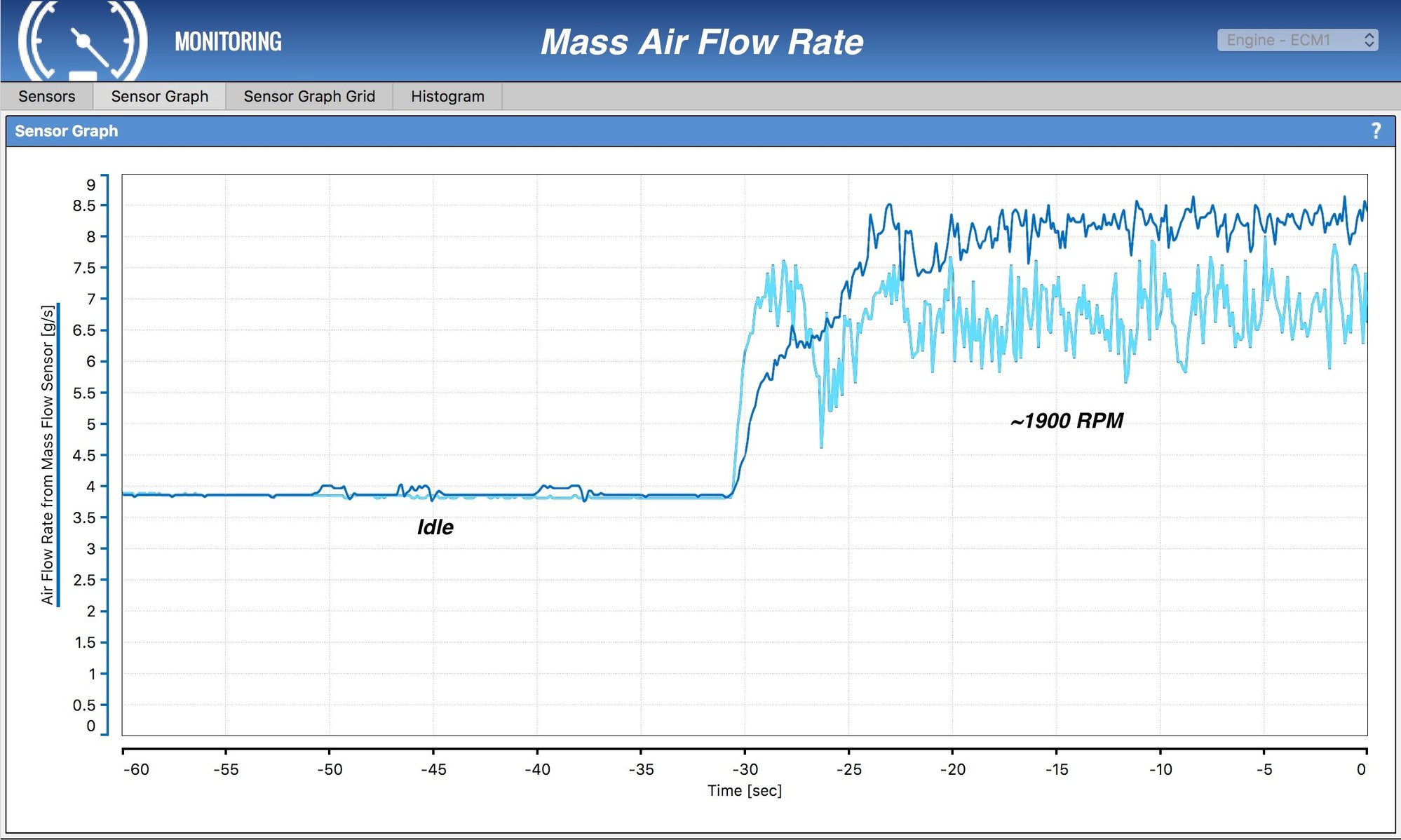At idle, the grams per second air flow rate is nearly identical...which corroborates with fuel trims being normal at idle. But look at the difference in air flow rates once I give it some throttle and hold around ~2k RPM. Not only is PCM1 air flow rate erratic (as compared to PCM2 MAF), PCM1 MAF is under reporting incoming air flow by ~25%...which is exactly the same amount the fuel trims are trying to compensate!