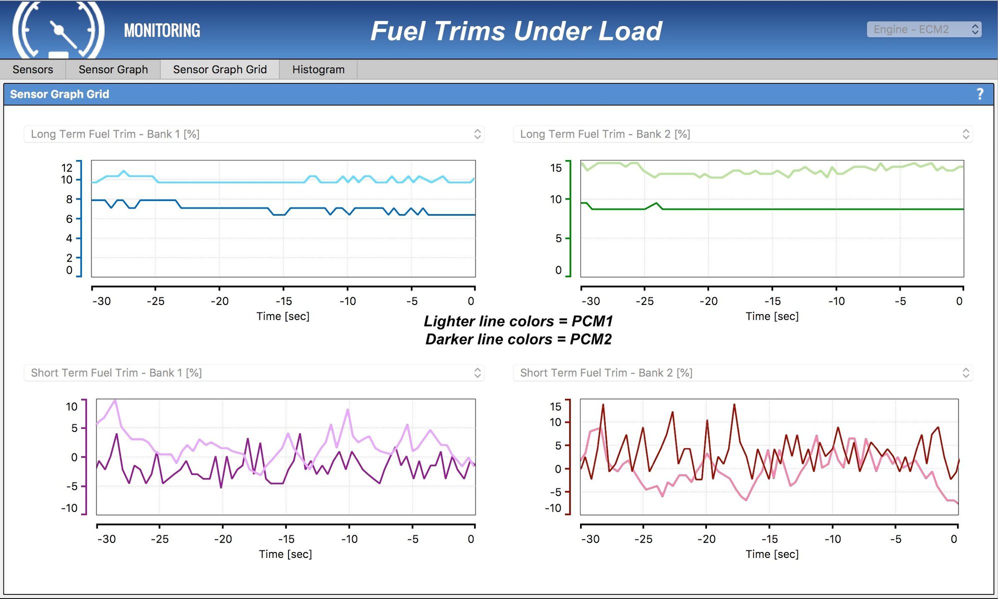 Bank1 and Bank2 long term fuel trims on PCM1 are now much closer to mirroring PCM2, which means NO MORE P0171/P0174 codes!!! The lines/data don't match up exactly but that could be due to the fact that I need to drive around more to complete the re-learning process of the long term fuel trims on PCM1. (In fact, you can see the short term fuel trims for Bank2-PCM1 [pink line in chart above] still dipping down to -5% which means PCM1 still pulling/reducing fuel from the long term trim. Compare this chart to the "Fuel Trims at Under Load" I originally posted above and I classify this as a FIX. :-)