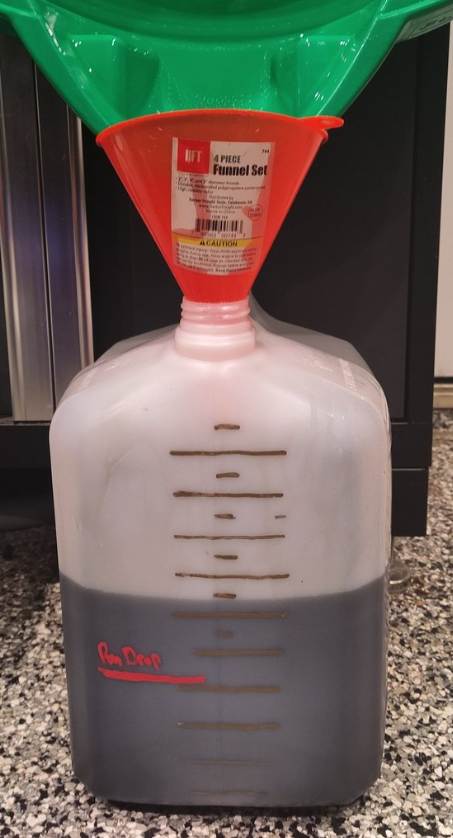 In total, recovered just above 9L in the jug... Accounting for some spills, maybe about 9.25L total. You can see by that Qty recovered that a simple pan drain and refill will not be sufficient to swap out the fluids, unless you go into a painstaking and wasteful multi-drain exercise.