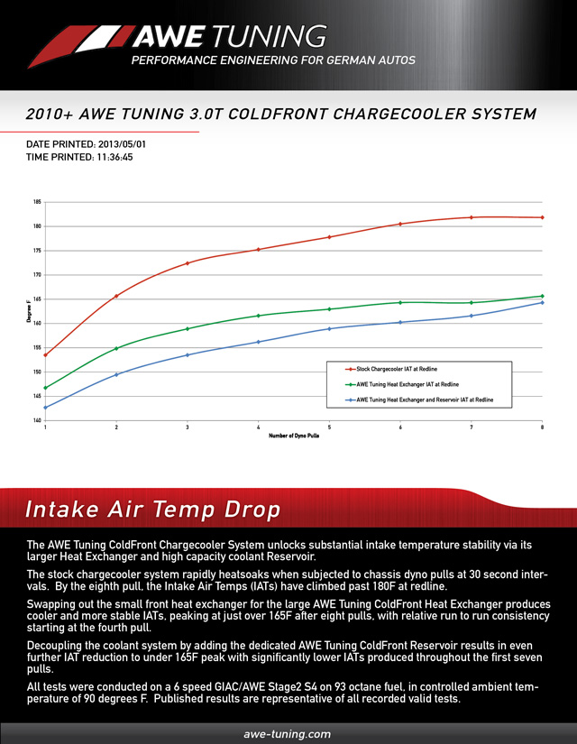 When used as a complete cooling solution, the AWE Tuning ColdFront System has been shown to decrease IATs by 15F after 8 pulls separated by 30 Second Intervals on a B8 S4 equipped with GIAC/AWE Stage 2 Software in controlled ambient temperatures of 90F.