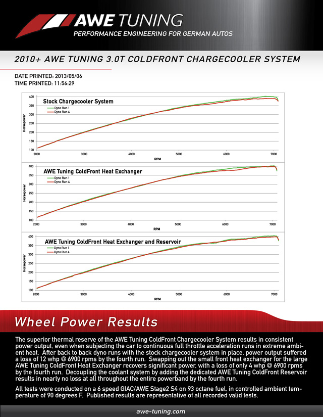 After continuous full throttle acceleration tests using the stock heat exchanger, on our fourth run, power on a car equipped with the AWE Tuning B8 Stage 2 Performance Pulley Kit was down 12whp. With the ColdFront System in place, power loss was nearly non-existent after four runs in the same ambient conditions!