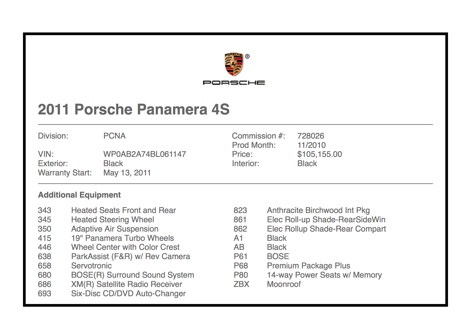 Here for sale is my meticulously maintained 2011 Porsche Panamera 4S. I am the second owner and purchased the car in 2013 with about 9,000 miles on the clock. Current mileage is about 98,000. The exterior of the car is finished in Basalt Black Metallic over black interior. The car sits on the 20” Turbo wheels with Pirelli P Zero tires. The car is well-optioned with the Premium Package Plus, ParkAssist front and rear with the reversing camera, Anthracite Birchwood Interior package, electric roll-up shades, heated seats front and rear. The car recently underwent major services totaling up to more than $16,000. Work included brakes, air suspension and camshaft sprockets. Records on hand. Car also has full front end clear bra installed. Exterior is great despite minor road rash on lower front bumper. Minor chip in front windshield. Interior is near perfect. Car is located in Los Angeles, CA. Asking $32,000.