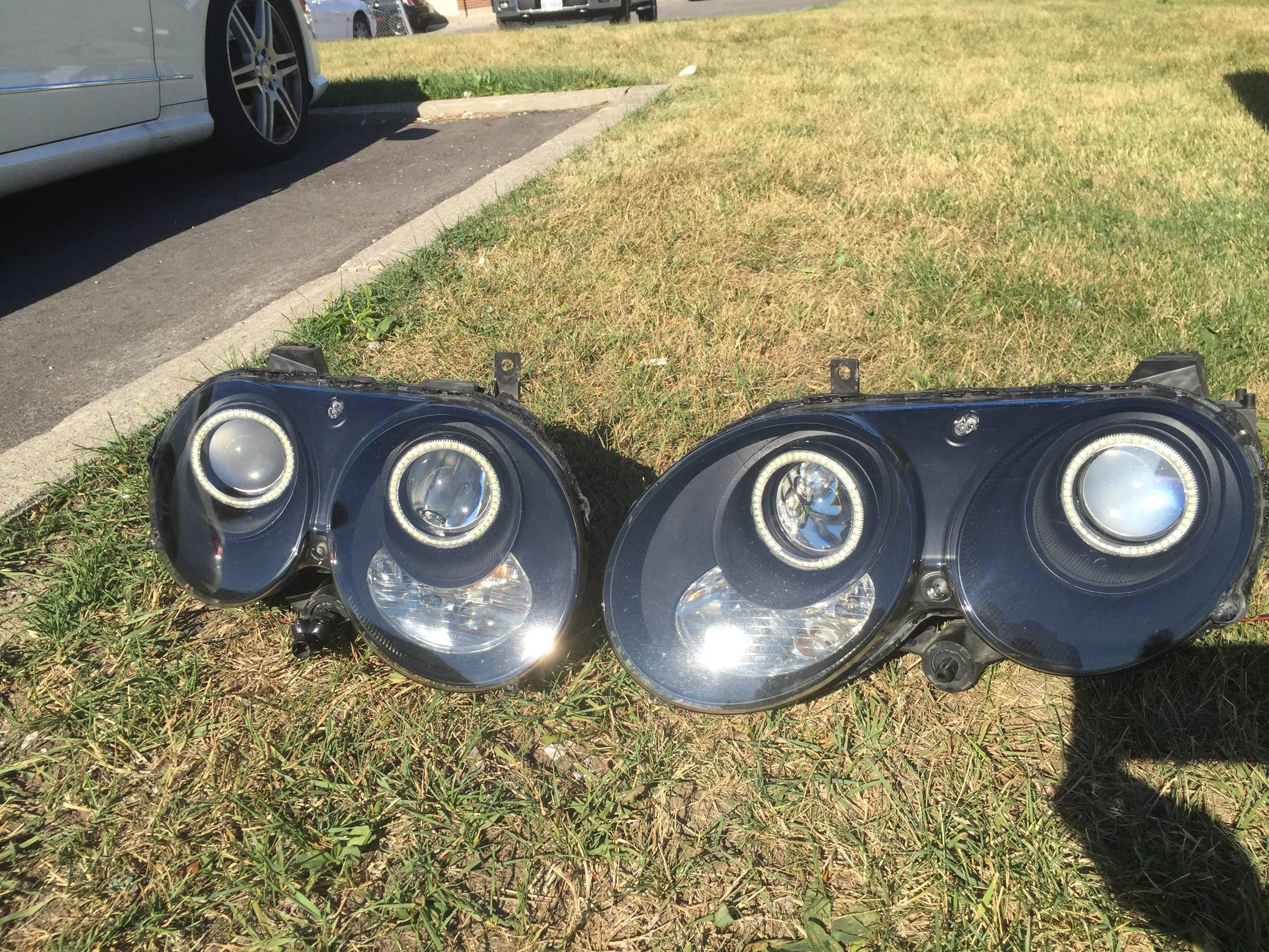 b)After: added 4 angel rings to match factory headlight colour; painted housing to black; polished the interior lens to get rid of tiny burn marks.