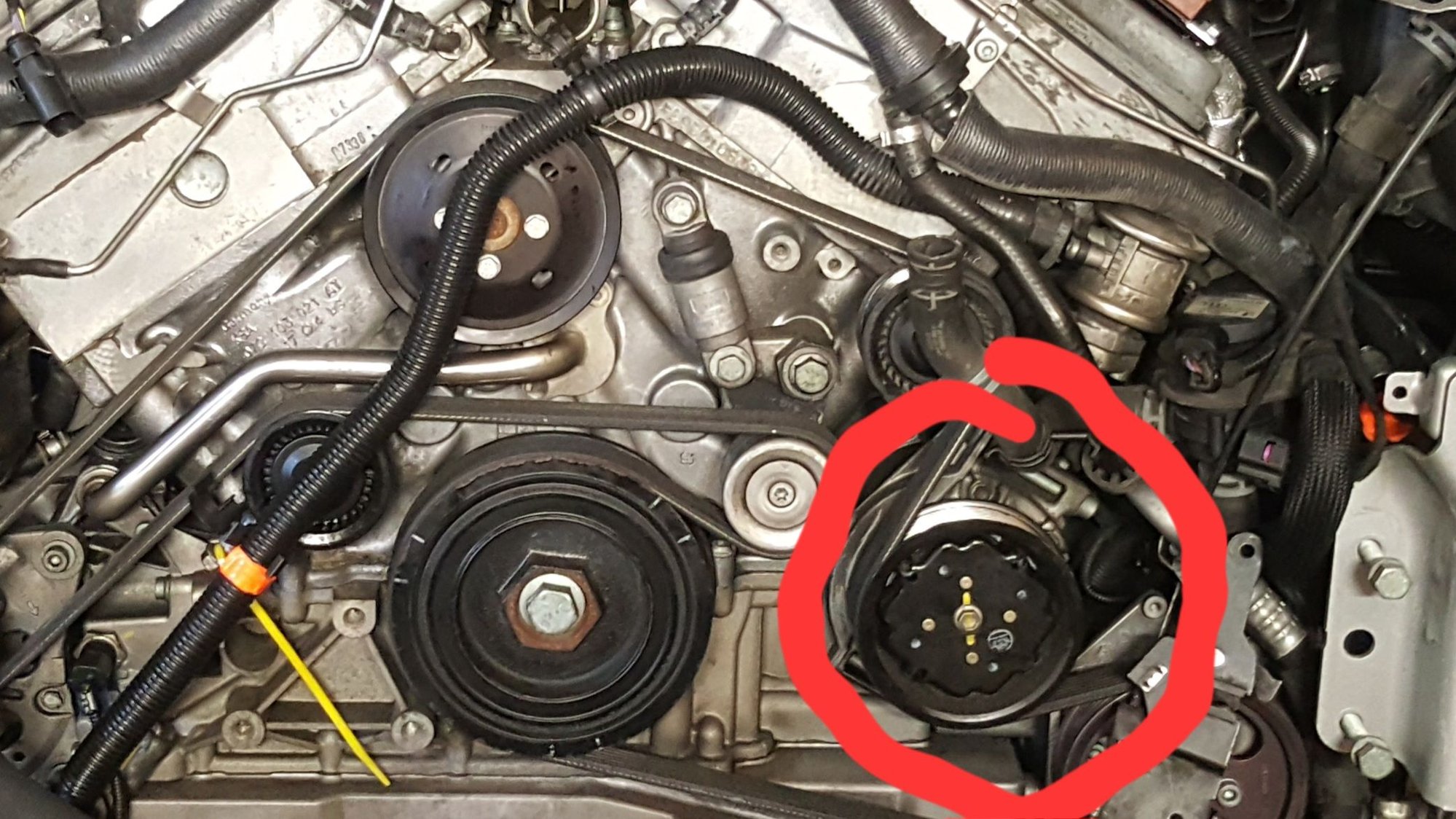 Tech 2 is correct. Attached photo is as he stated. The a/c refrigerant compressor is circled in red.