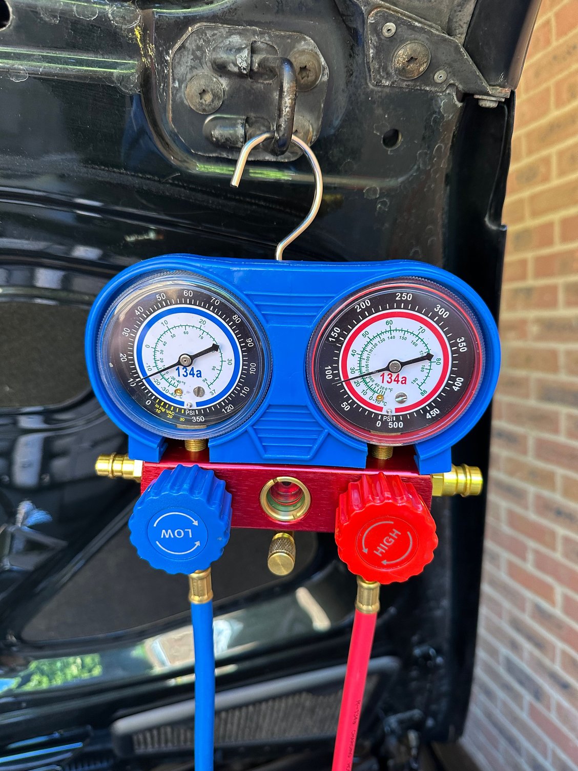 So I chanced my arm and added more refrigerant. This canister started with 510g, and I had used some on a previous vehicle. I think about 600g is needed for the GT. I emptied the can and ended up with 21psi on the low side and about 160psi on the high side. Every couple of minutes it would drop by a couple of psi and then go back up again. Previous experience tells me this is normal (that’s based on a system with a clutch, not the GTs refrigerant control valve), but it should be in the range of 30-40psi on the low side. The worrying thing for me is that when I switched the engine off, the low side shot up to 90psi: