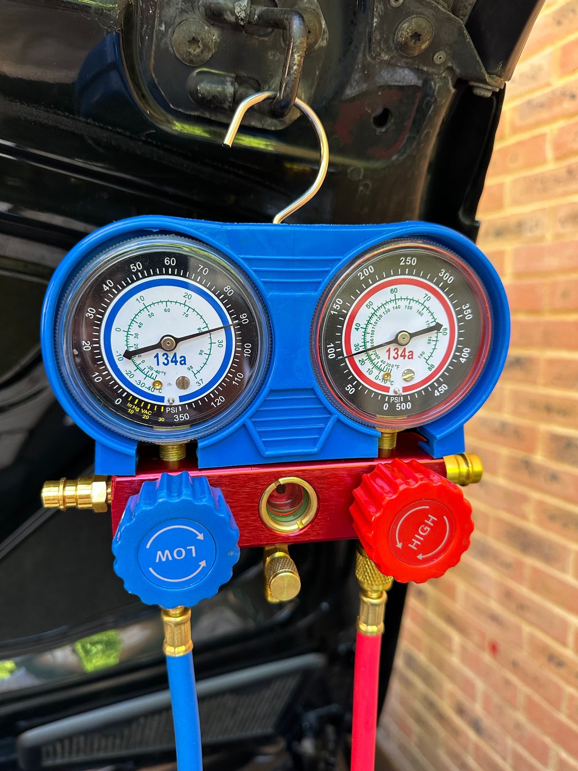 I imagine the disappointing cooling performance is down to simply not adding enough refrigerant. I’ve just had another go and used a manifold gauge set to monitor pressures. Maybe you can have a gander and see if I’m heading down the right track…
