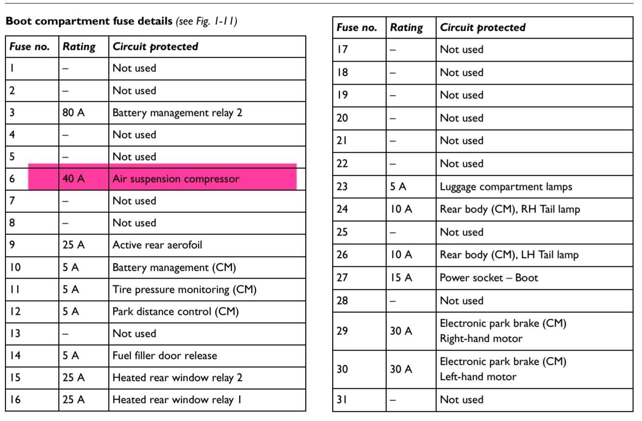 No luck yet. Checked all 3 fuses they look good (both to the eye and multimeter). Reconnected batteries and put in emergency start mode/parallel. Instrument panel shows ride height error of course (yellow warning). Tried small incremental moves to the front (both sides) with jacks, including quite high.. no sign of life to the corners. If anything the left front is sitting a little lower today (but not down on the wheels and can still get a jack under the jack points). Tried first with ignition on, thereafter with engine running for some 10 minutes.