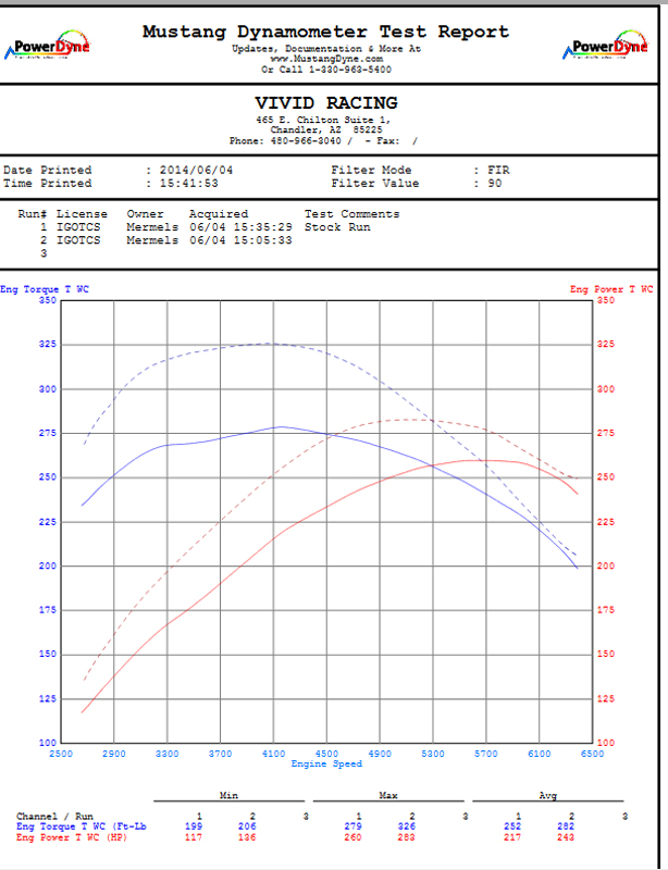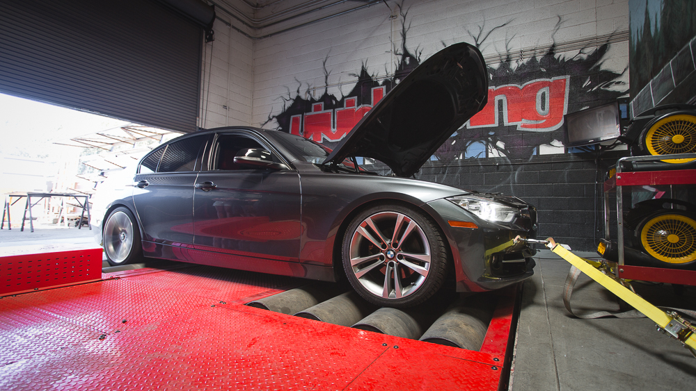 Our test vehicle was a 2012 328I. Running the car in rear wheel drive mode with a ambient temperature of around 105F using 91 octane, our baseline stock number was 253rwhp and 226ft/lbs of torque. Since the VR Tuned Tuning Box is a plug and play, it took us about 30 minutes to tap into the necessary sensors and get the car ready to run again. Doing 3 runs on the N20 engine, numbers were pretty consistant with the gains over stock. Peak torque was around 4100 rpm gaining 50 ft/lbs and peak horsepower was at 4900rpm gaining 30 wheel horsepower. From our start test at 2500 RPM, the car gained substantial power all the way to around 6100 rpm. With the addition of a downpipe and exhaust system, we should see further gains to redline.