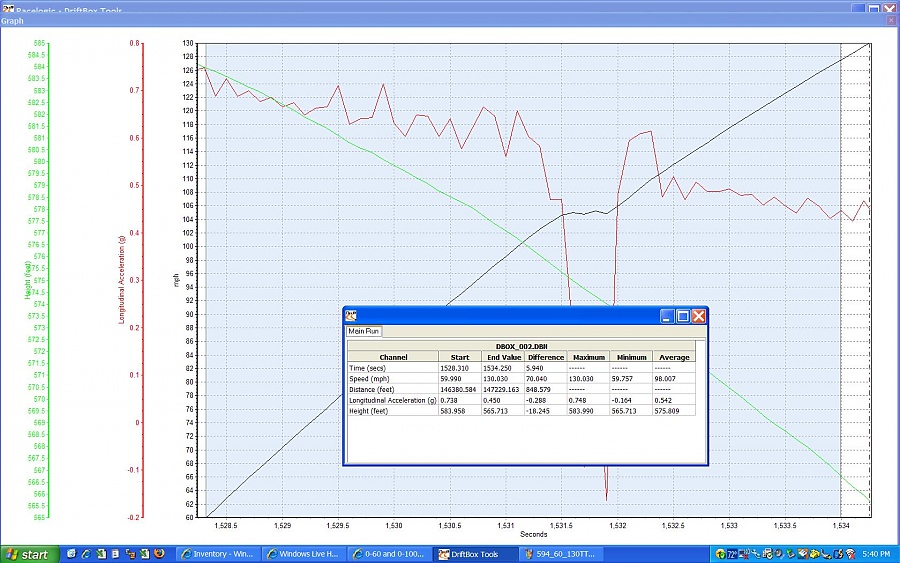 Today I was messing around with my Driftbox in the car and did a couple 60-130mph runs. Both runs were made starting in 3rd with 1 shift and ending in 4th. The times of the 2 runs are approx. 5.94 and 5.98 seconds. The other day I had a 60-130mph time of 5.5 seconds, but the file was corrupted so I was unable to graph it to make sure it wasn't too much of a downhill slope. Once I get better tires put on, I will try to improve upon these times, and also try some runs in the race gas mode.