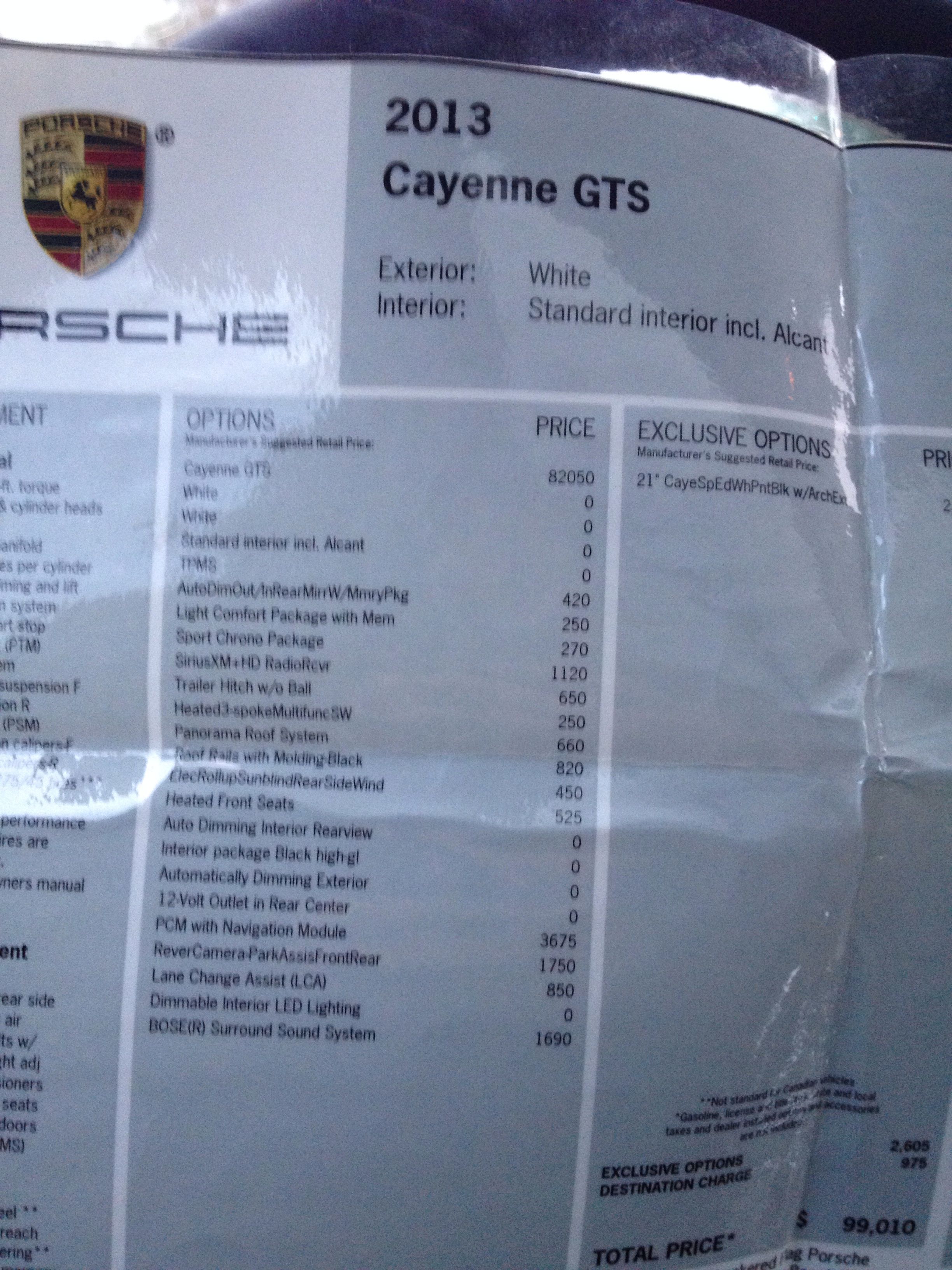Michael - MSRP on my GTS was also $99k. Options are shown in the pic below. I don't have PDCC or PTV. I love my Cayenne, but you're right….this deal is almost too good to pass up. I'll decide by the weekend.