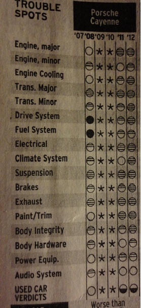 Does anyone knows how the Cayenne fared in the latest report. I know that Porsche is ranked 9th. It also states that the worst one among Porsches is the 911 while the best is the Cayman (kind of interesting since both share lots of common parts). There was no mention of Cayenne, Q7 or Toureg.