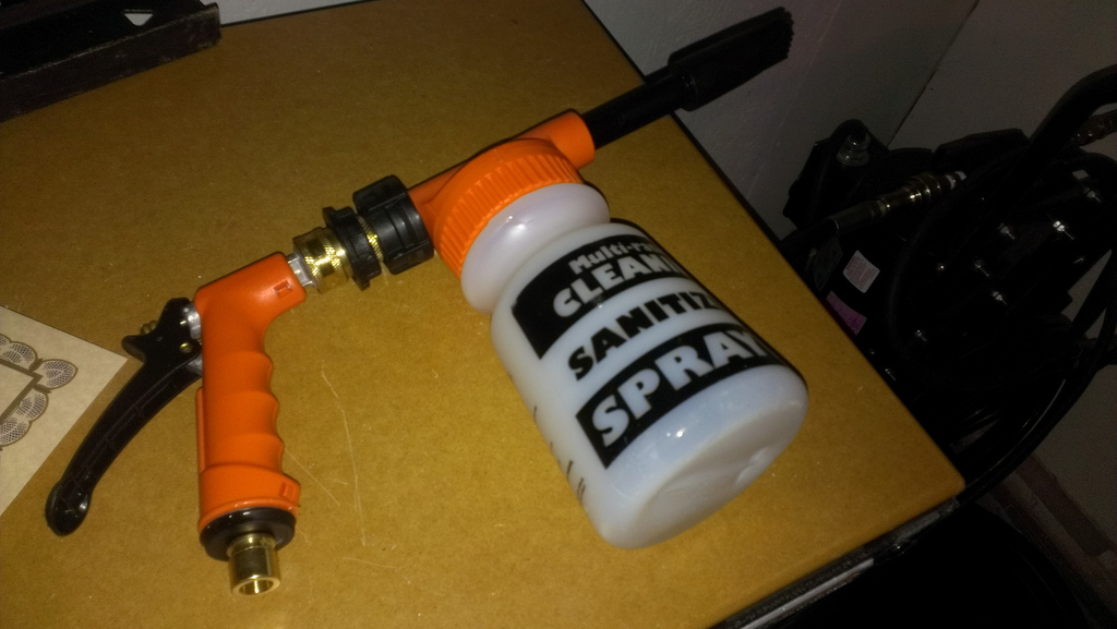 I put the quick connect fittings on the garden hose, the foam gun, and my cheap adjustable spray nozzle.