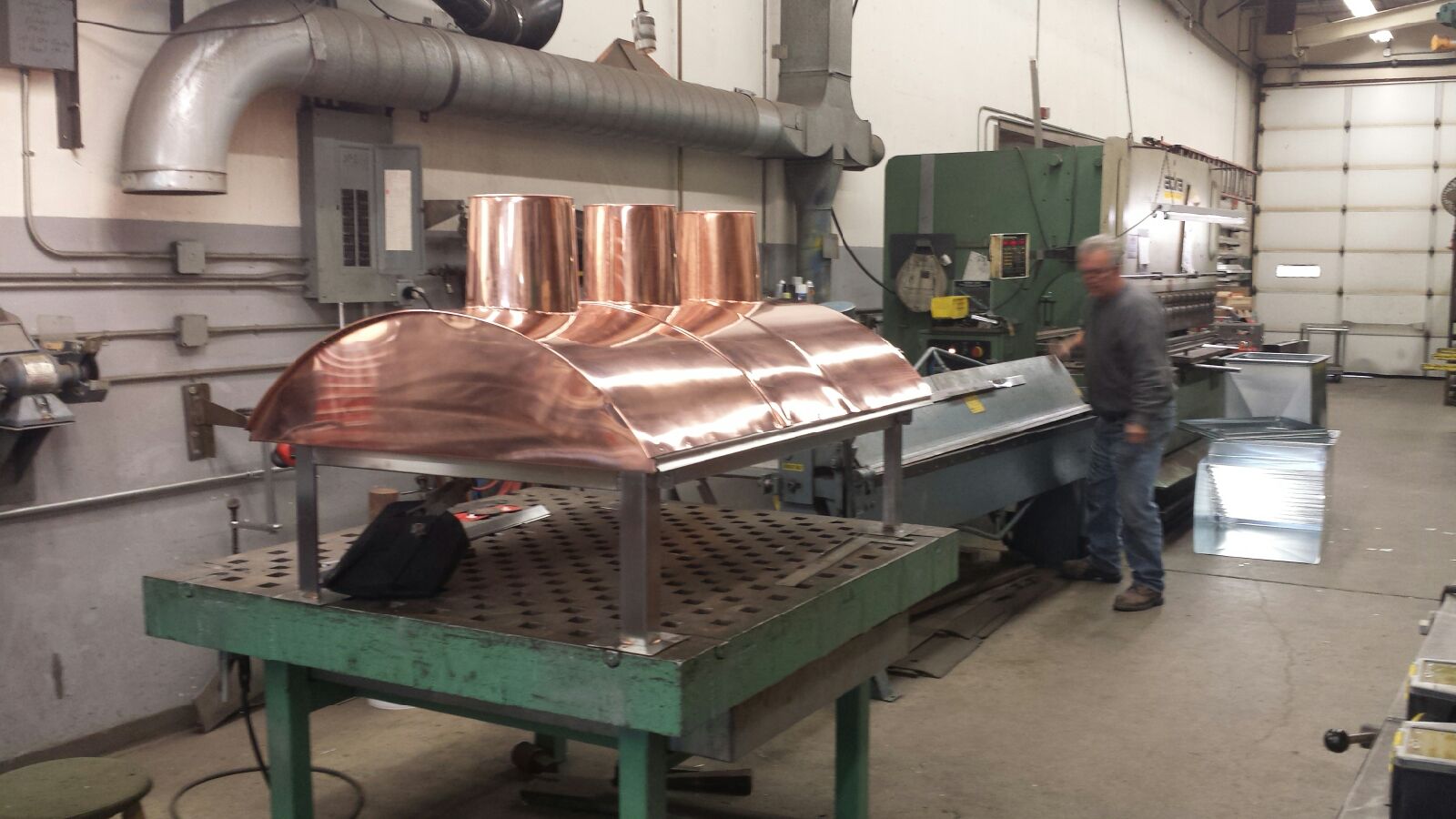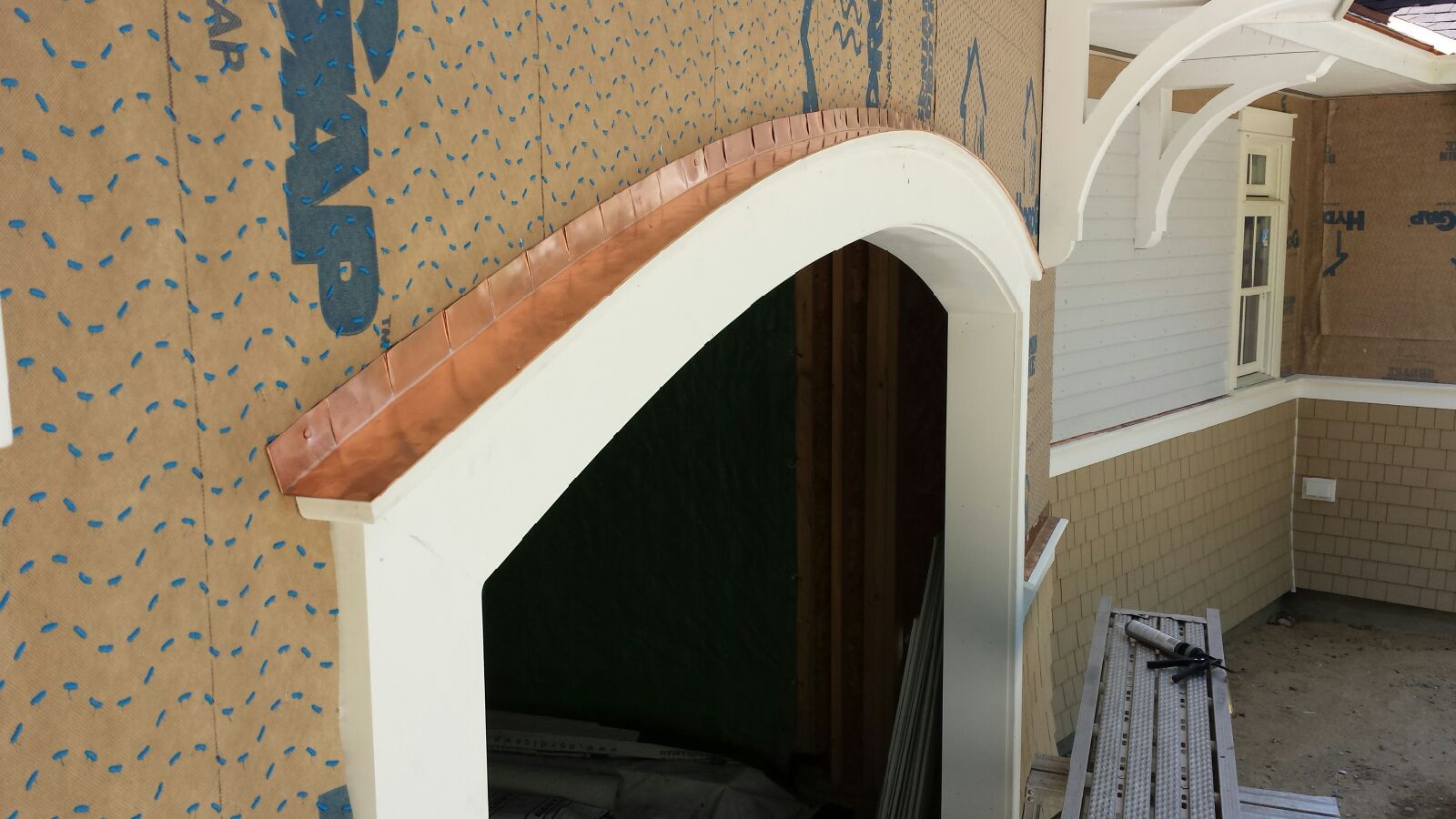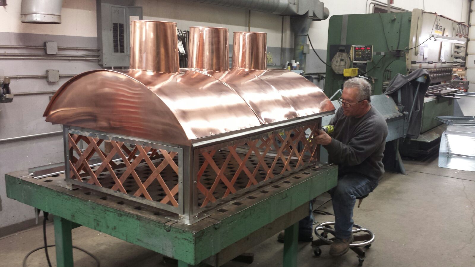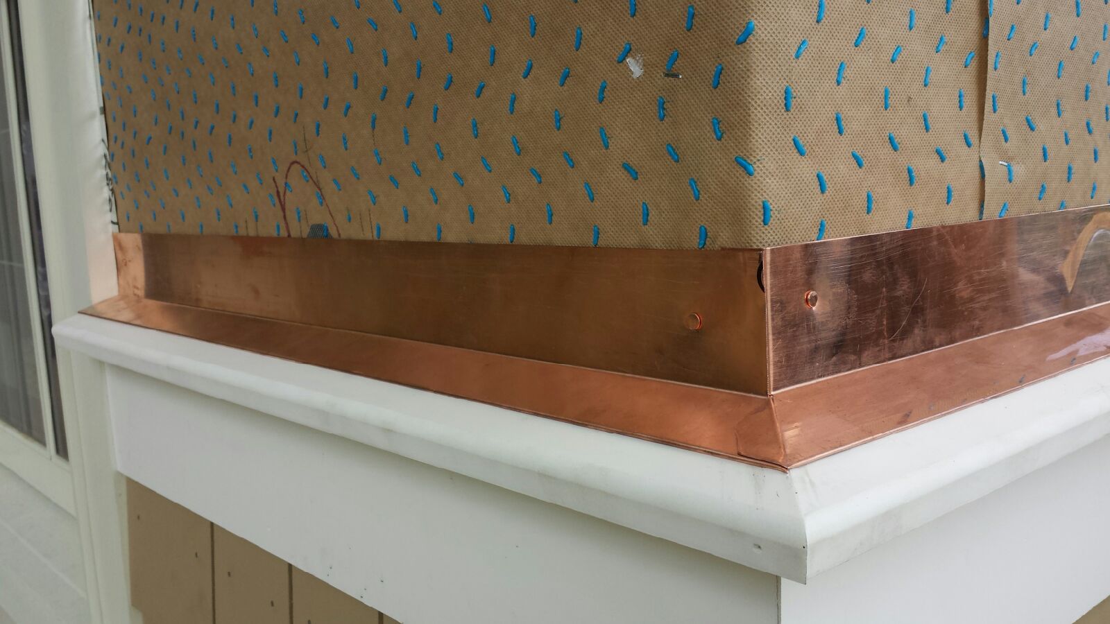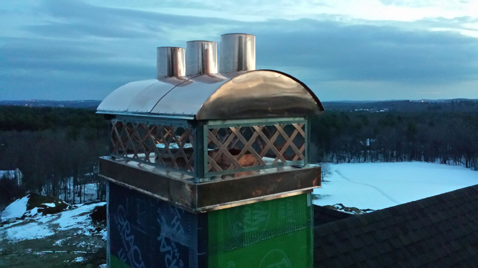 I built a copper chimney cap with a hinged top section after looking around. I wanted the ability to clean the flues. The disappointment is that the stone mason did not have the weather to finish the stone work outside the house now that it is really cold. He has been inside for the past month so we will have to wait till spring. I however still wanted to install my chimney cap.