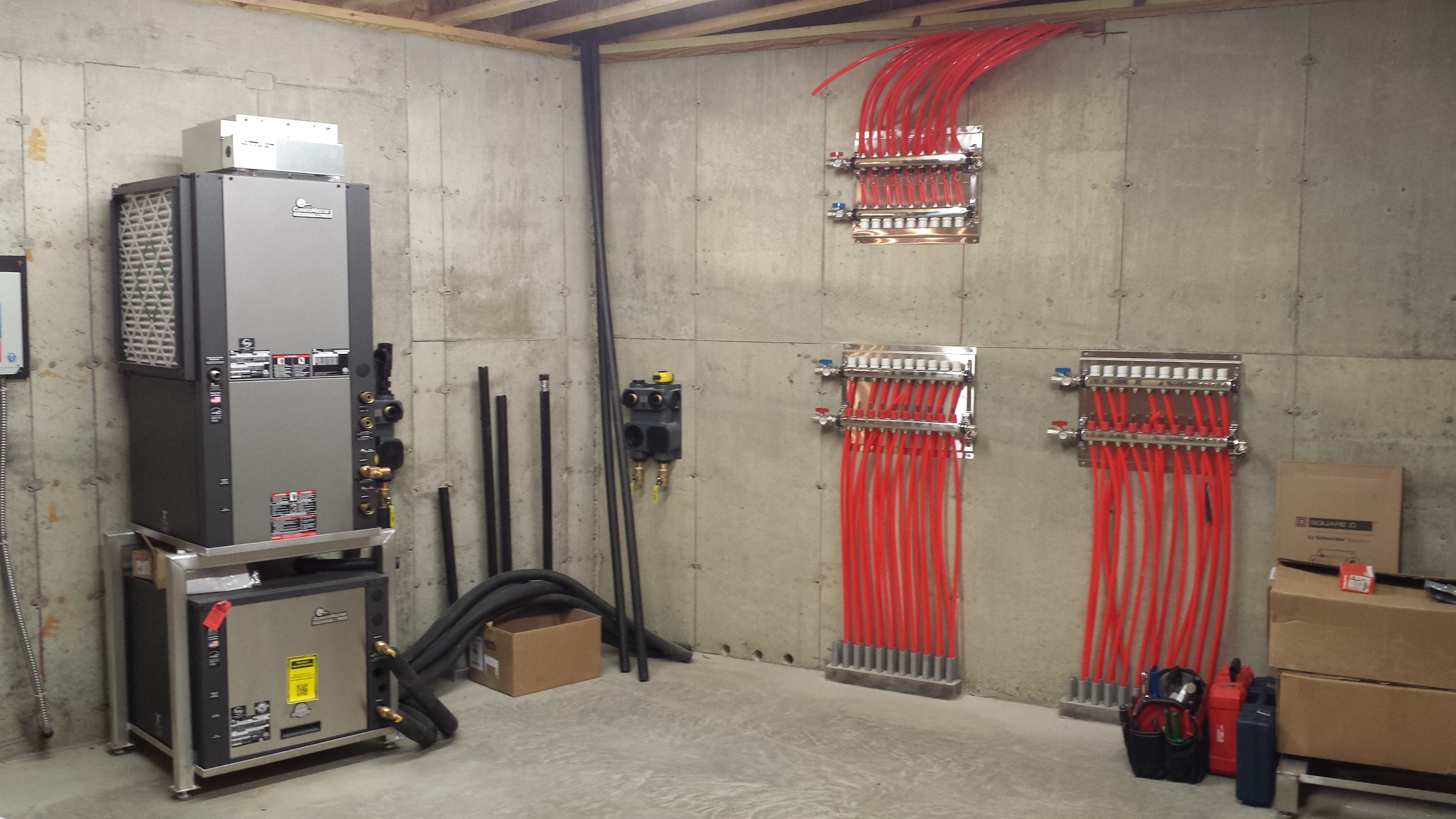Yes those radiant manifolds on the wall are for the two garages and basement. I have a 3-ton geothermal unit to keep them warm. By spacing the radiant tubes 8" apart not 12" I will be able to heat the rooms with 89 degree water not 112.