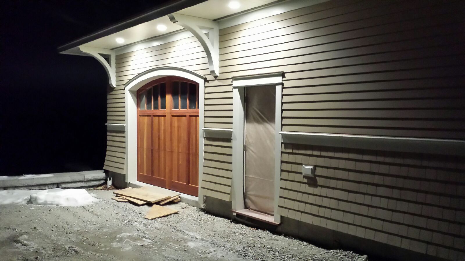 We are going to program the system so that when the garage doors are opened at night the lights in the garage and interior kitchen area and outdoor soffit lights also turn on.