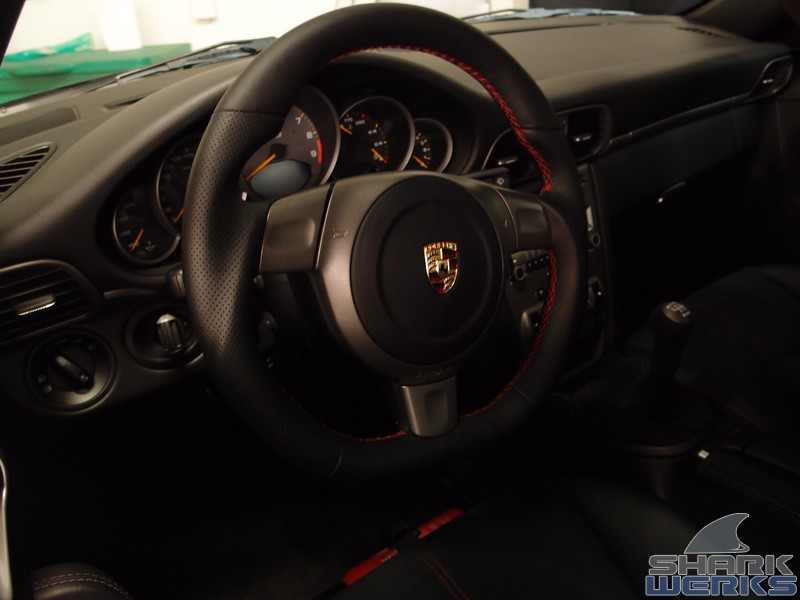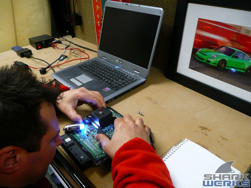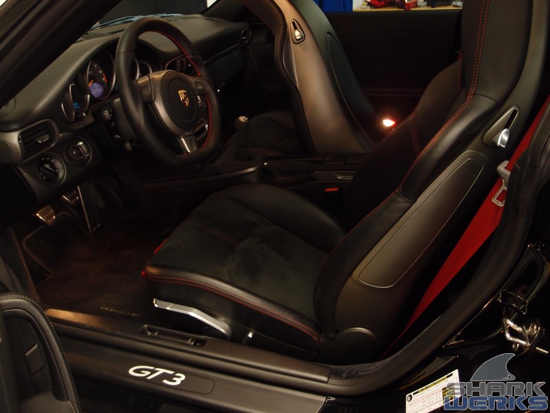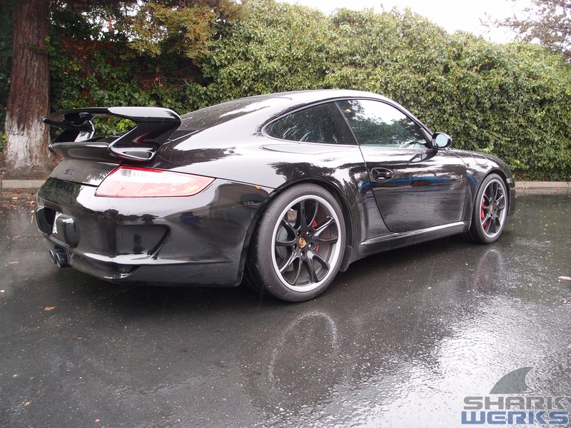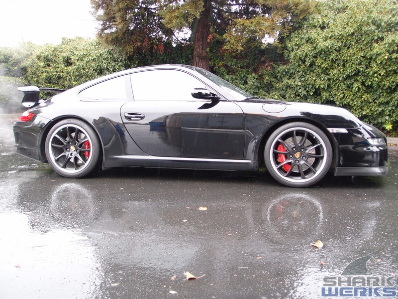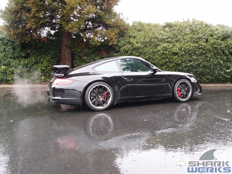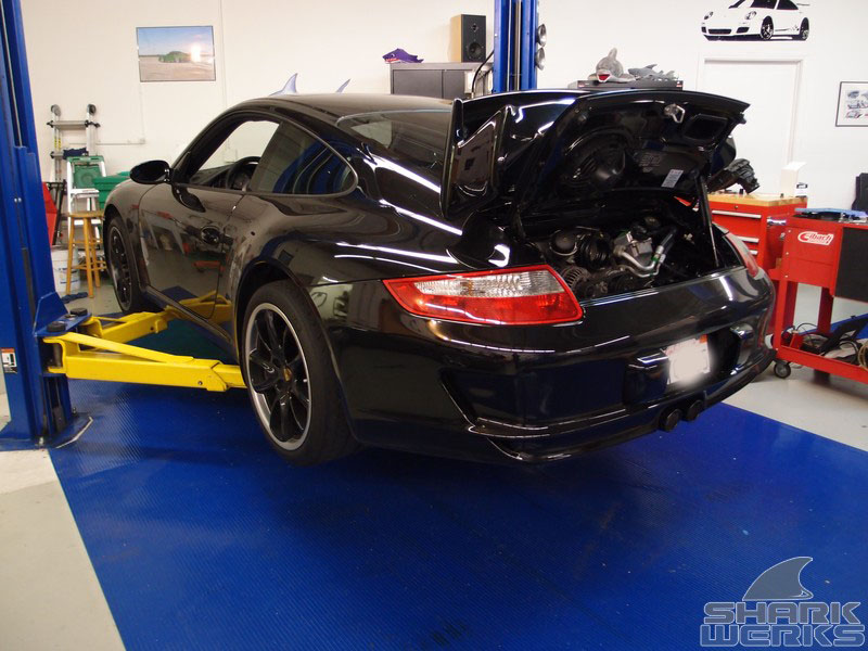 Come rain or shine on any given week day you can usually find a GT3 being worked on at the Shark Tank. This particular 2007 black (with red accents) MK1 997 GT3 came in for a bite that included our Stage 1 performance kit with the EVOMSit software and SharkWerks exhaust: