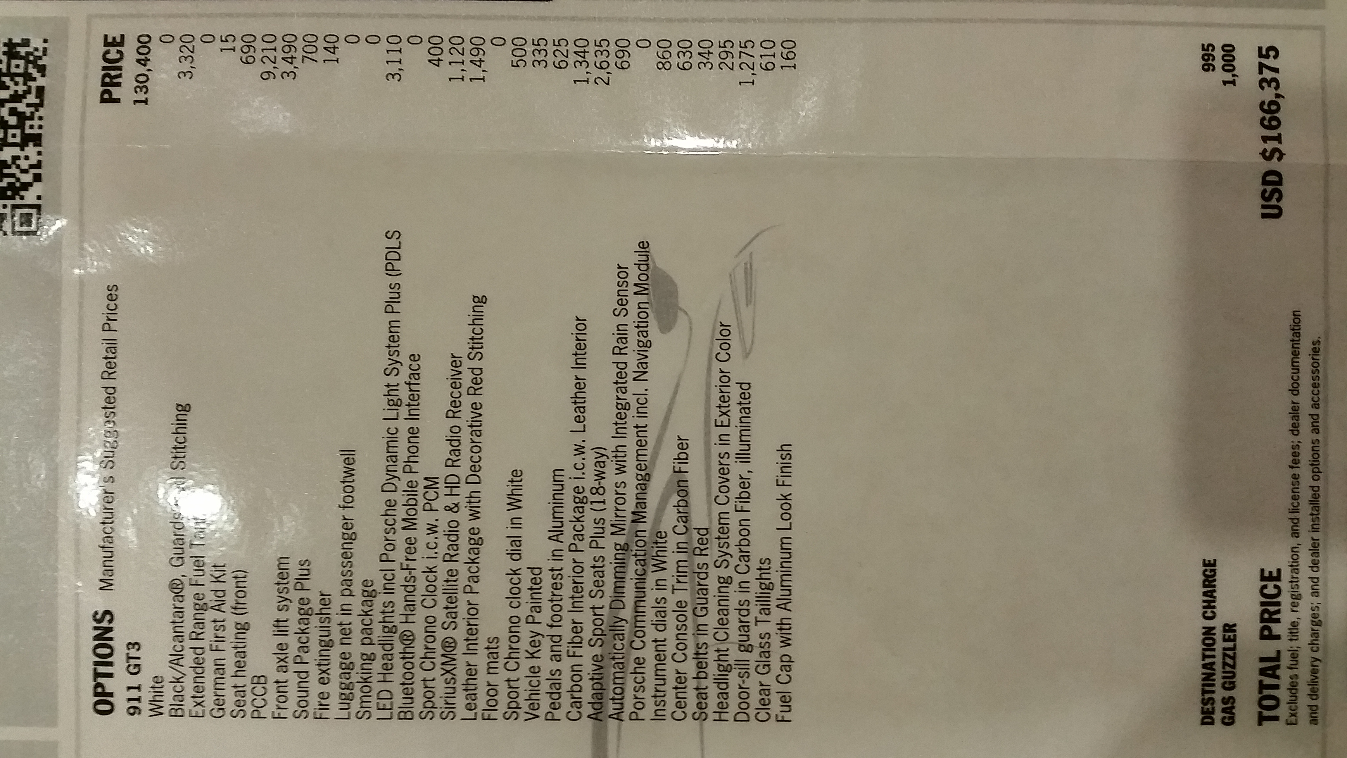 Thanks everyone. Drove it home today and WOW! The engine and exhaust note is fantastic. I only took it up to 7k so I am just counting the break in miles at this point. I really want to hear it at 9k.. Then I'll have to decide whether I'm going to put on the Cargraphic or Sharkwerks muffler bypass system.. I just can't leave anything stock. what do you guys think? Cargraphic or Sharkwerks? The PDK is stupid fast. So much faster than the PDK in my last PS4 and faster than any other PDK I've driven. I must say that for short moments, I do miss the 3rd pedal. Here is the MSRP with the specs.. Also a pic of my 8 month old boy sitting in it for his 1st time. The GM is a friend of mine and he threw in a Porsche Tequipment car seat and a baby 911 for my boy. It was a fun day. Can't wait for the weekend to get some more seat time.