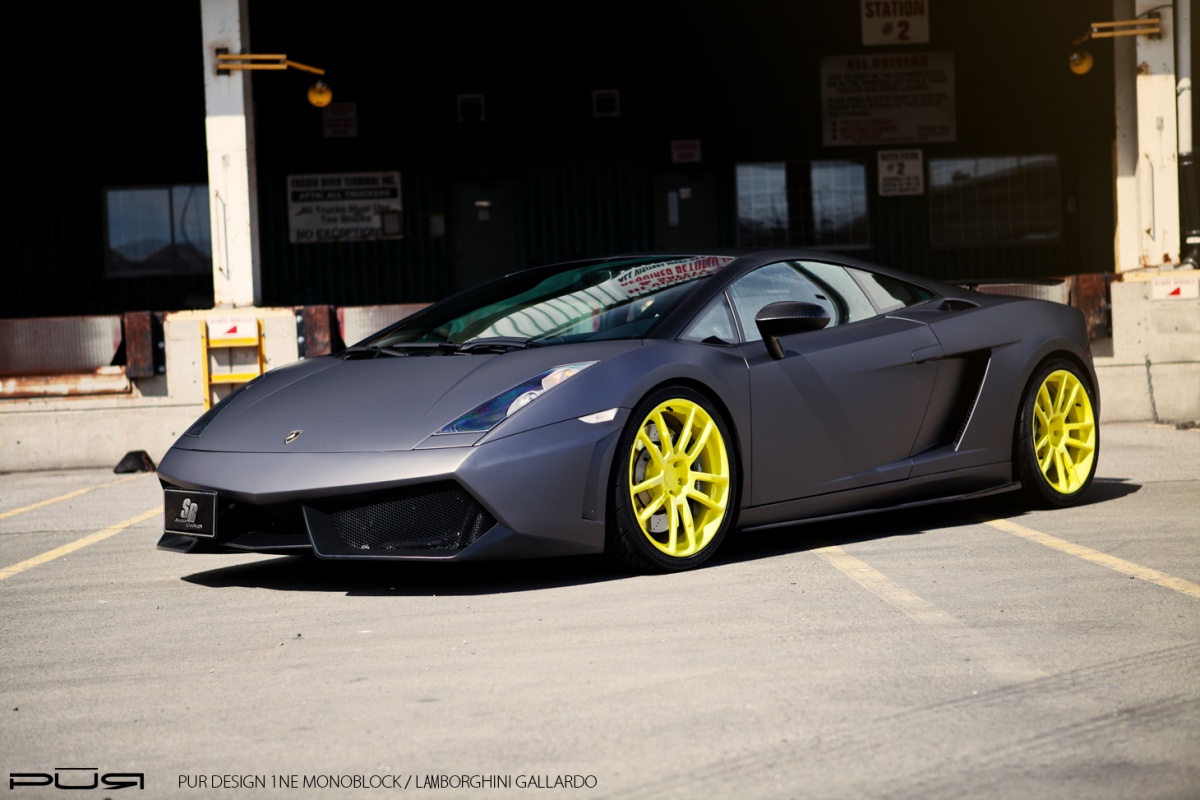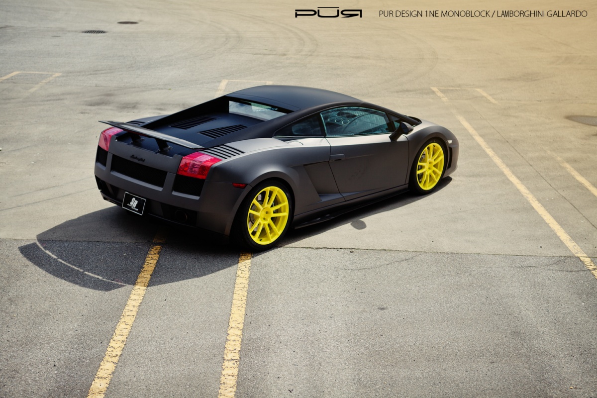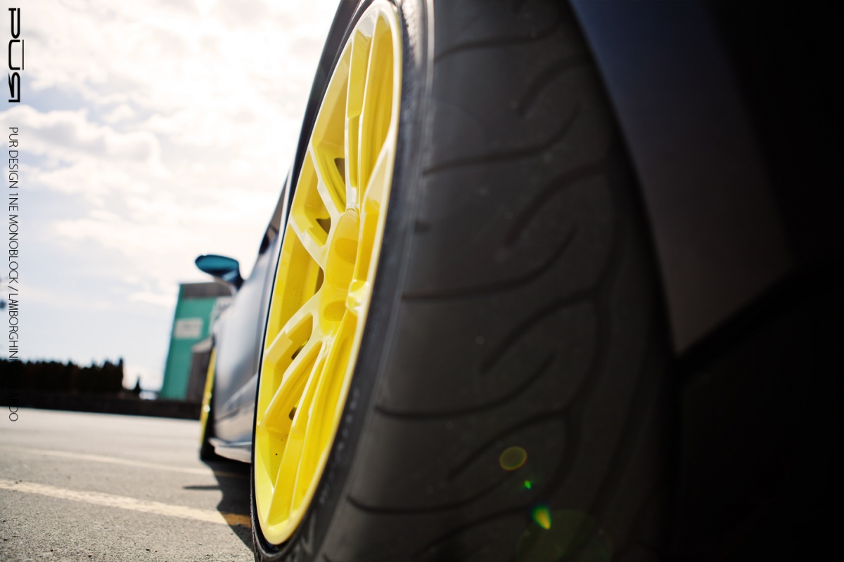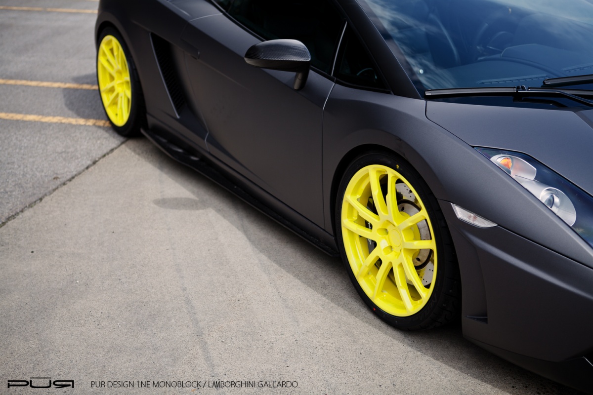 Here we have a Lamborghini Gallardo wearing a set of PUR 1NE monoblock wheels. The wheels measure 19x8.5 front and 19x11 rear and finished in Lamborghini's "Giallo Tenerife" yellow.