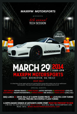 MAXRPM is having it's 6th annual tech session on Saturday, March 29th - starts @ 10:00am and goes until 2:00pm - 6 different presenters!! - BBQ lunch and then there is a road rally from 3:00-5:00 pm - $1000.00 first place prize!! - door prizes - 50/50 drawing and then dinner at Anthony's Home Port restaurant - RSVP required - 200 car limit - see and click on attached flyer!!