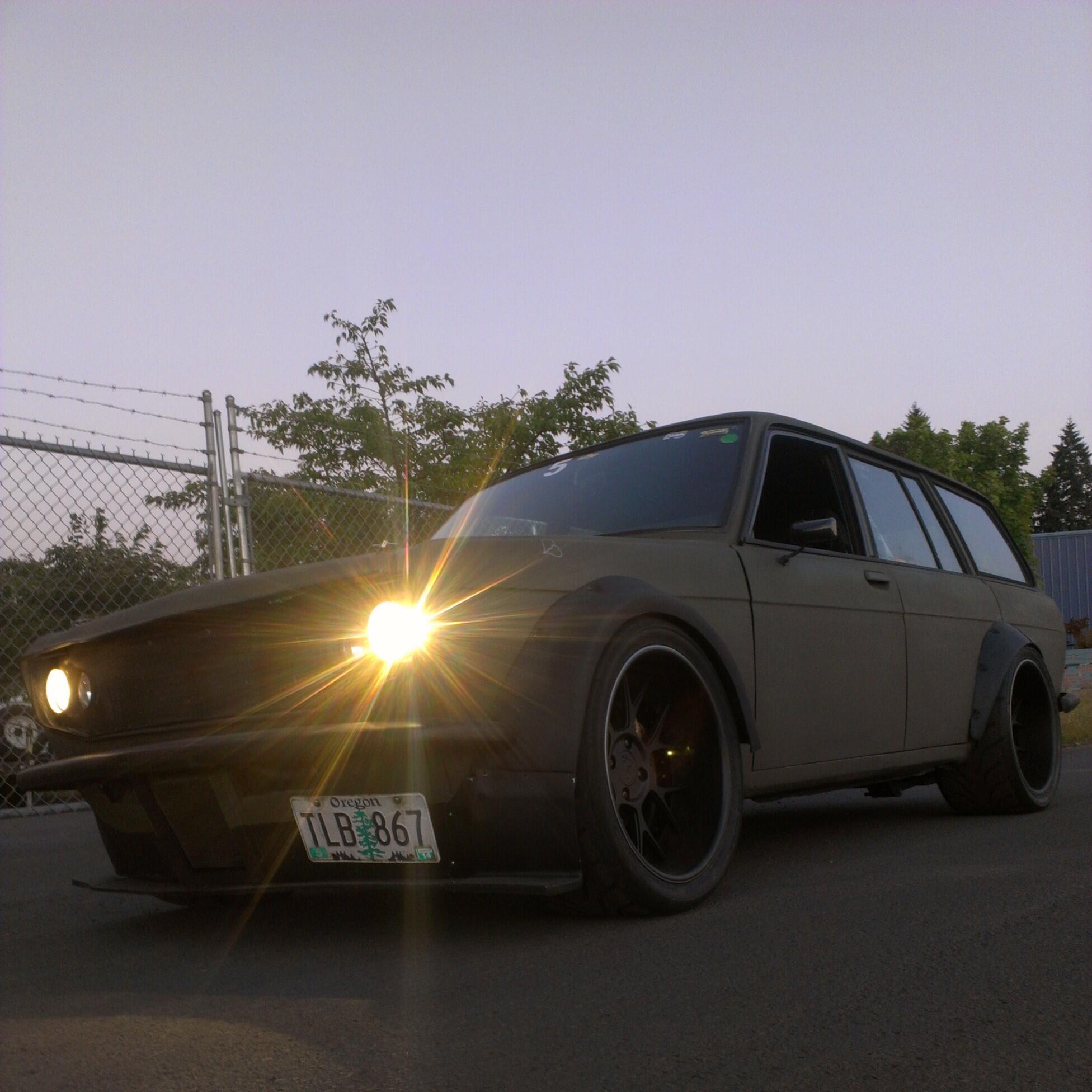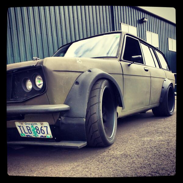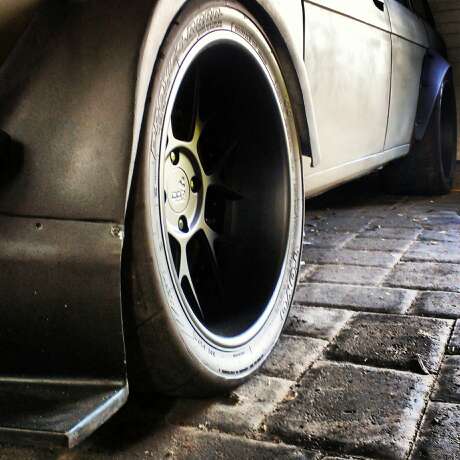 Flares were wide enough at the top. Nowhere else, so pretty much redid the entire front flare except the mouting points. Still working on the rear of the fronts. Undecided. Ended up painting the wheels flat black. Silver pinstripe you can't see here. Instagram filters. Voila'