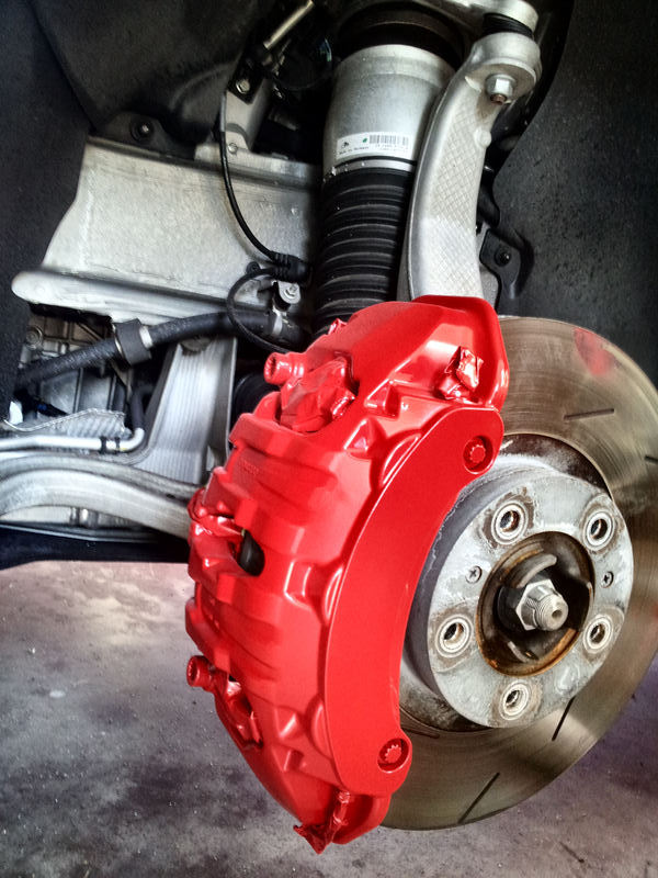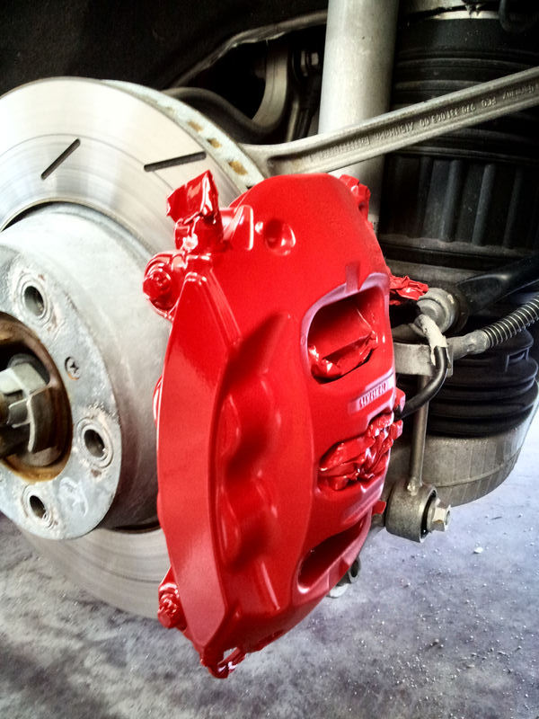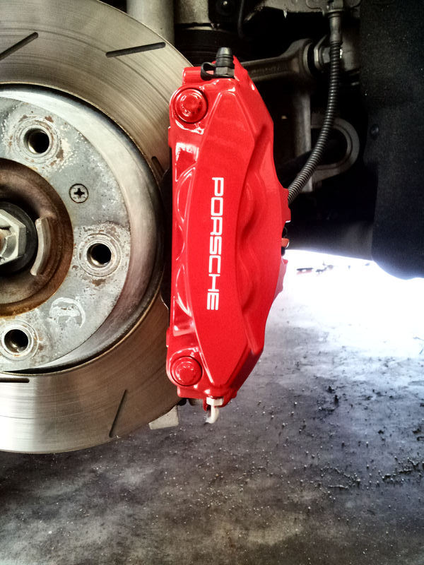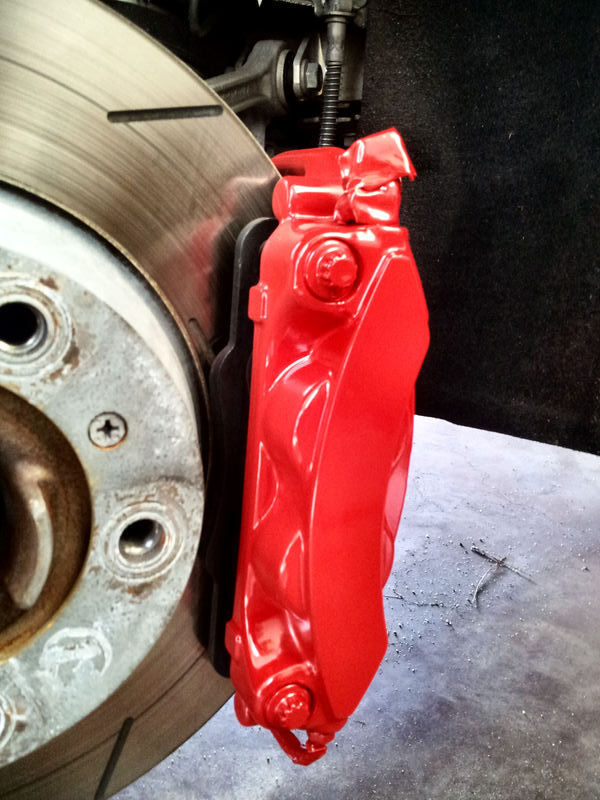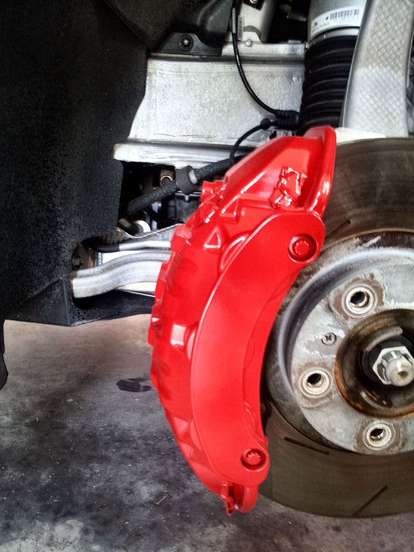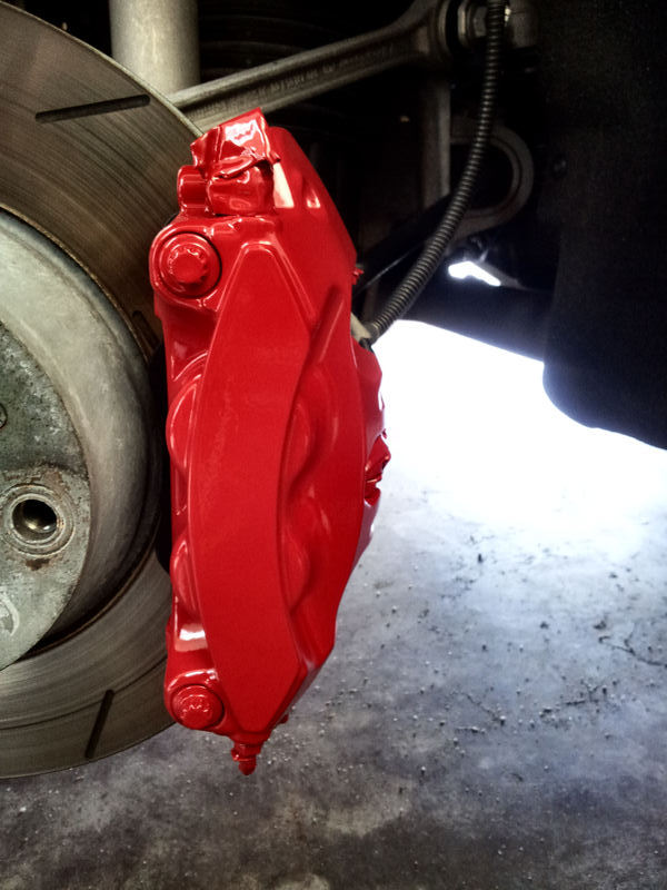 Painted the calipers on my P4S... They were silver, which I thought looked good, but I think the red looks much better. I used the G2 caliper kit and a high temp clear coat - Prep/painting took me about 12hrs total. As you can see, there's still some tape from the prep.