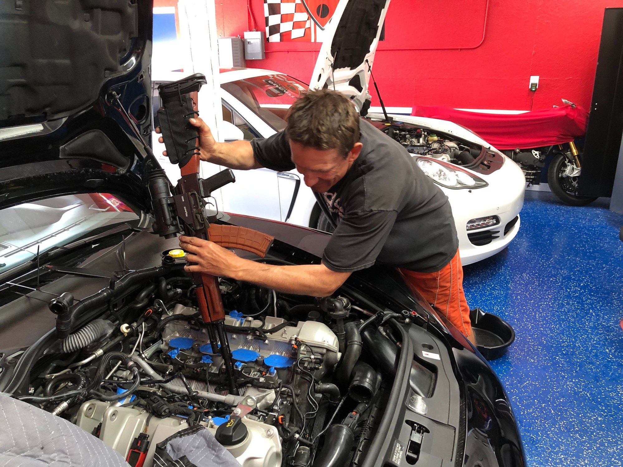 here's our most creative use of a pry bar : Use an ak74 as leverage to remove the thermostat housing. That housing was the most complex thing to remove on both of our cars.