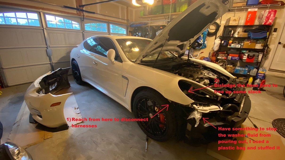 2) For the washer hose, on the passenger side when you remove the headlight. You can dislodge the hose from this location that can free up some slack to allow you to pull the bumper slightly forward. You then, should be able to reach in and unclamp the hose from the connection ...right behind the sprayer.