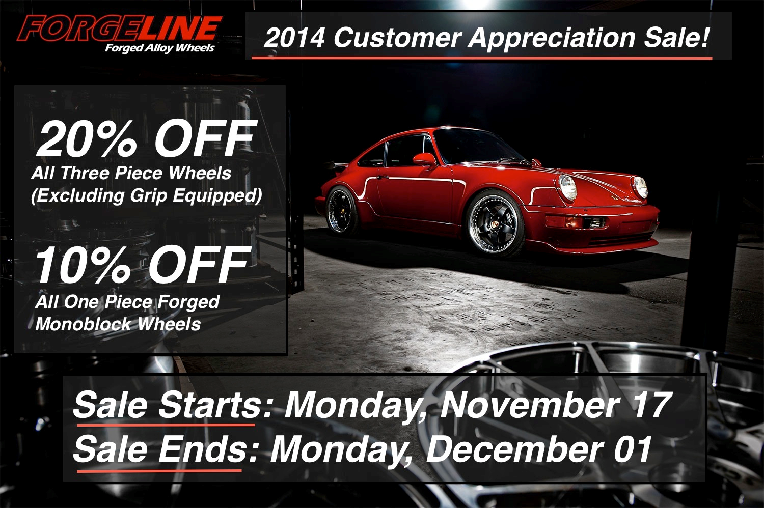 All Forgeline three piece wheels (excluding Grip Equipped Series) and Center Lock Conversion kits are on sale at 20% off the normal list price. All Forgeline one piece forged monoblock wheels are on sale at 10% off the normal list price. So celebrate the holidays for you and your favorite car by getting the wheels that you really want! But don’t wait too long; this sale ends at 5:00PM EST on Monday, December 01, 2014.