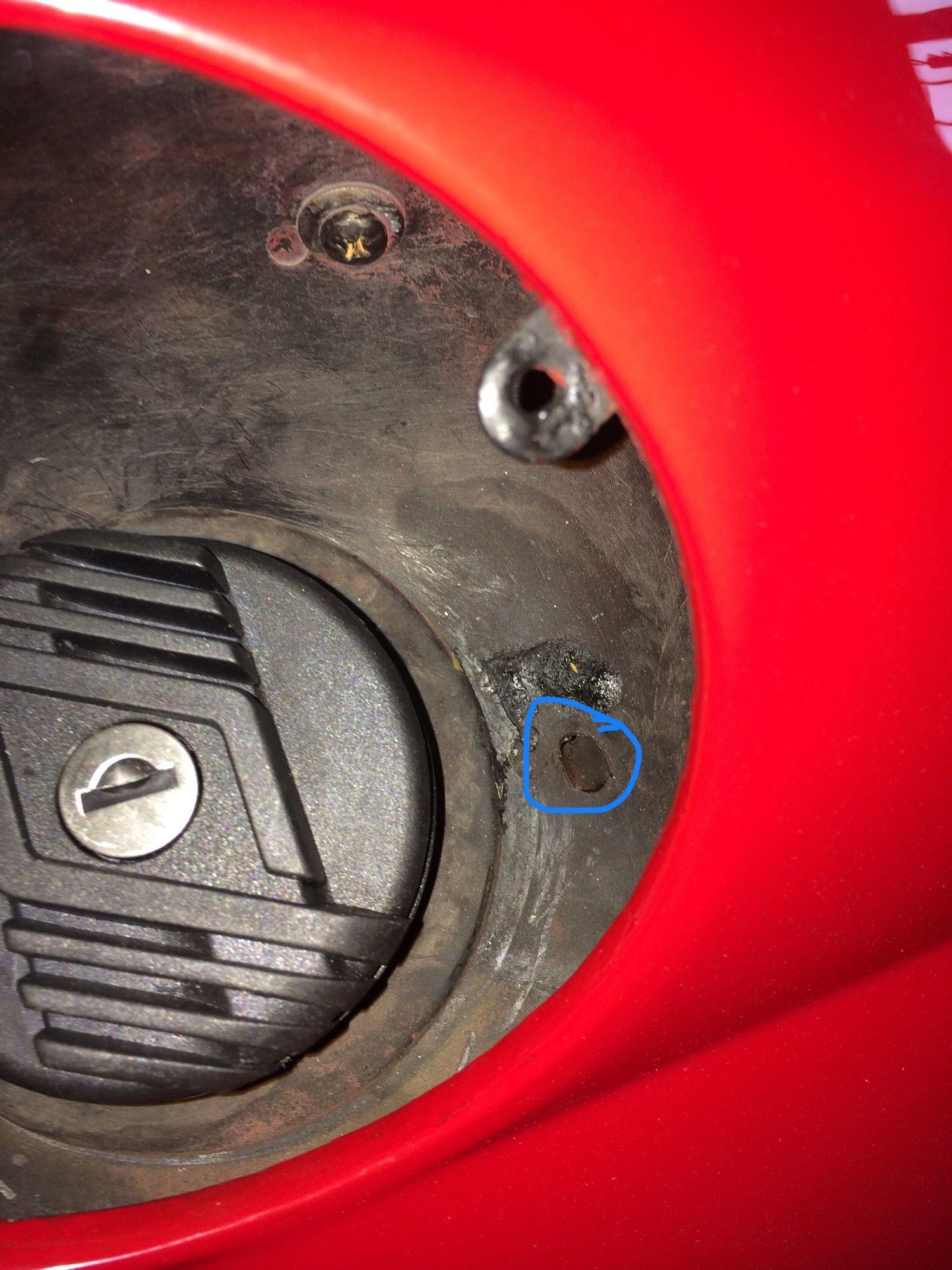 1970,s Ferrari with a nice size fuel filler drain highlighted in blue .Never clogged
