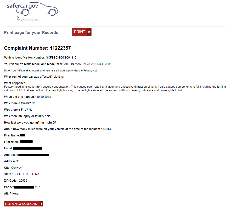 NHTSA complaint - 2006 AM v8v Headlights & Tail Lights