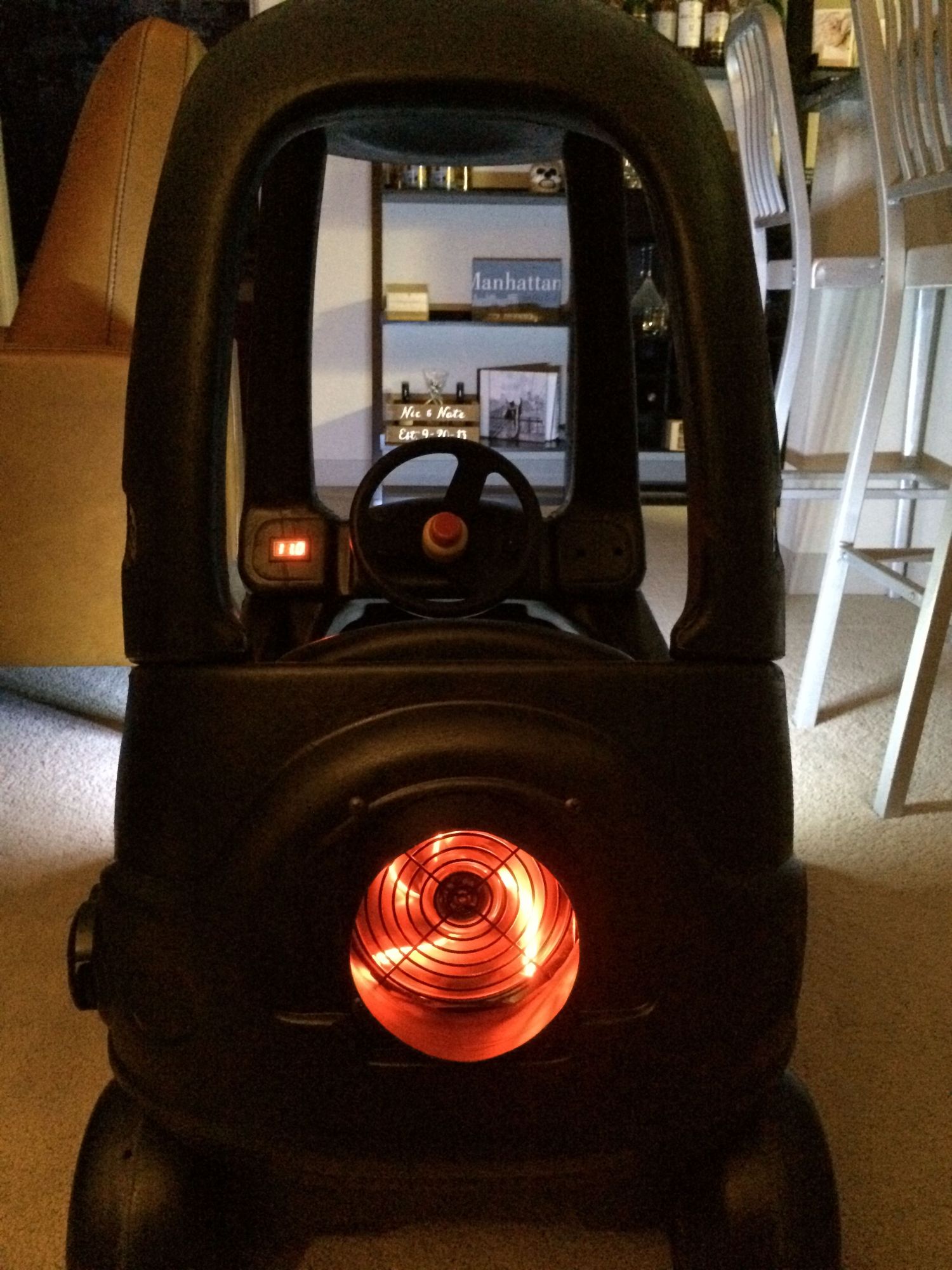 Operational Turbo fan and LED lights. Voltmeter to measure remaining battery power.