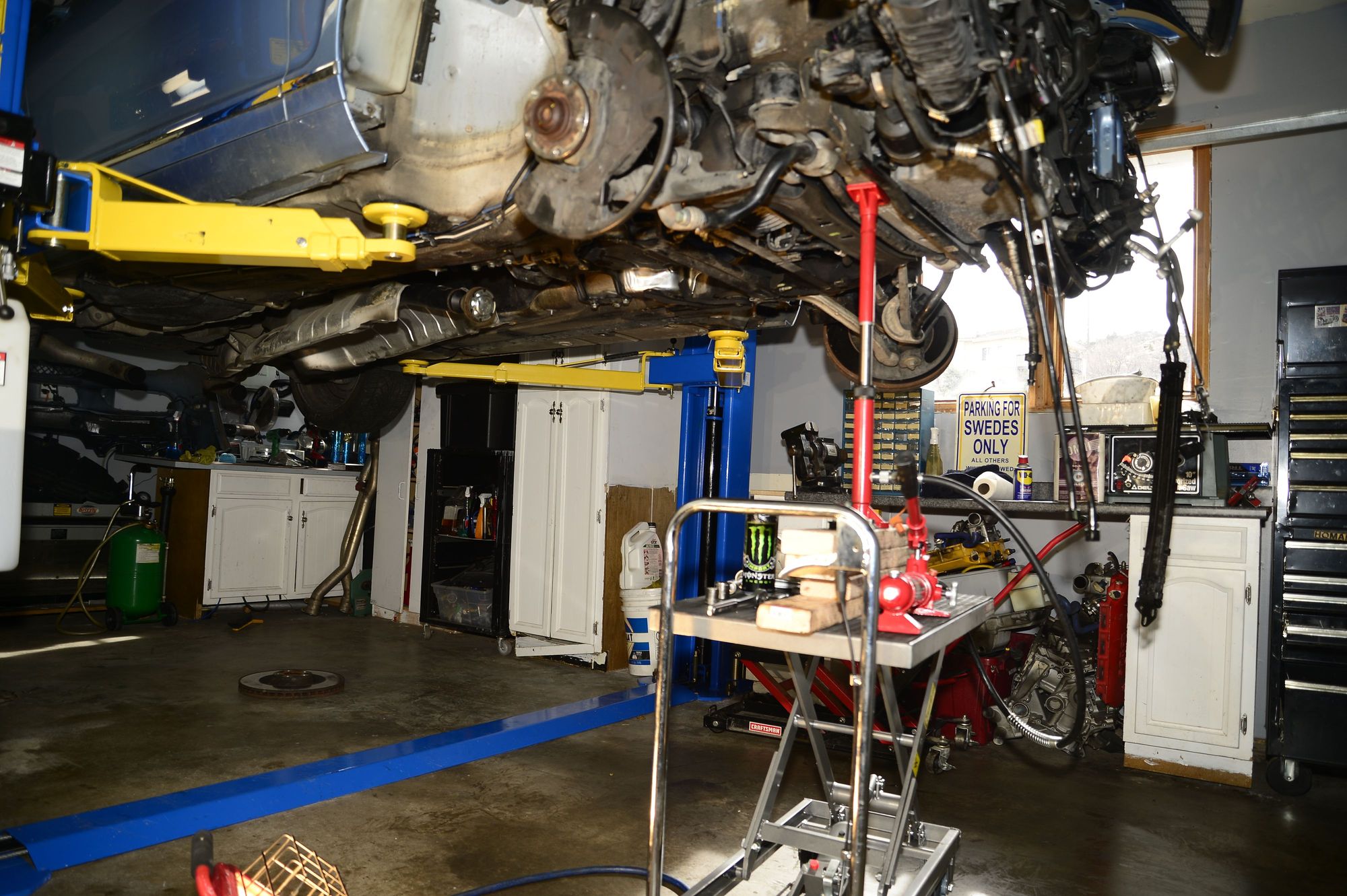 I was having some trouble aligning the secondary engine mounts to the chassis. Rigged this up, do I can move the engine just enough for the bolts to alight.