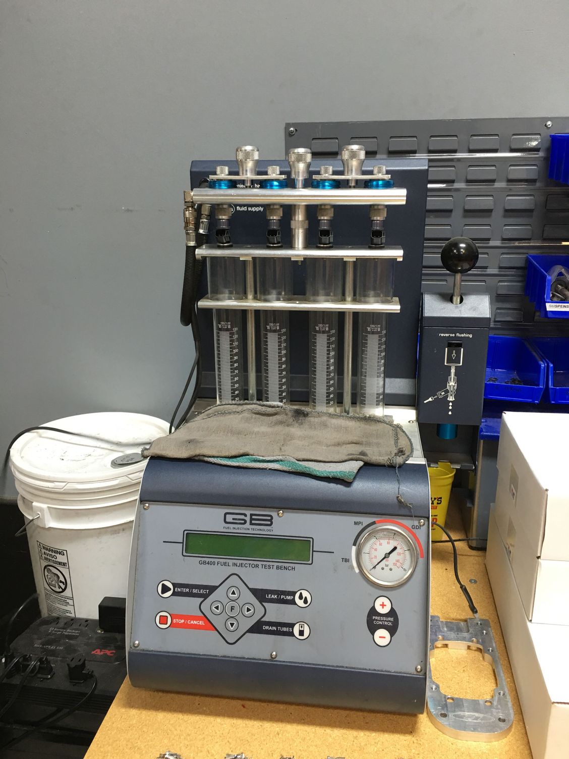 Since my original ID1300 injectors had been in the car for a while with E85 we decided to give them a quick flow check/cleaning. Of course Injector Dynamics HQ happens to have a bunch of toys for this.
