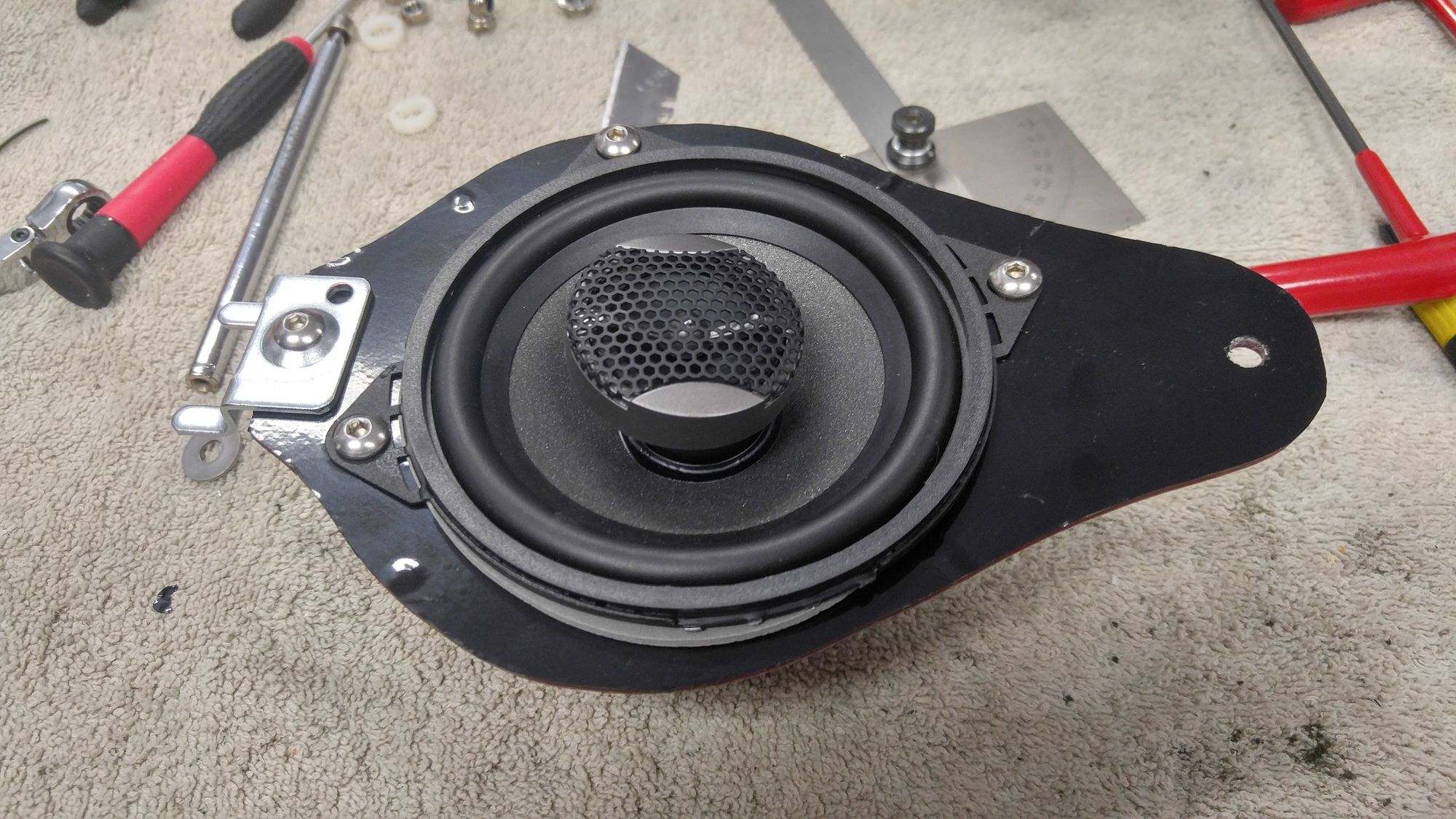 I traced the shape of the OEM mounting plate onto a piece of Lexan than then cut it out with my band saw and hole saw in a drill press. I had to break off one of the 4 speaker mounting tabs to prevent interference with the speaker grill mounting slots. I used a bracket I have for mounting things into slatwall which fit into the slot in the car to hold it perfectly. Once I had the plate built, I covered it with some black vinyl so it would look good through the speaker grill.