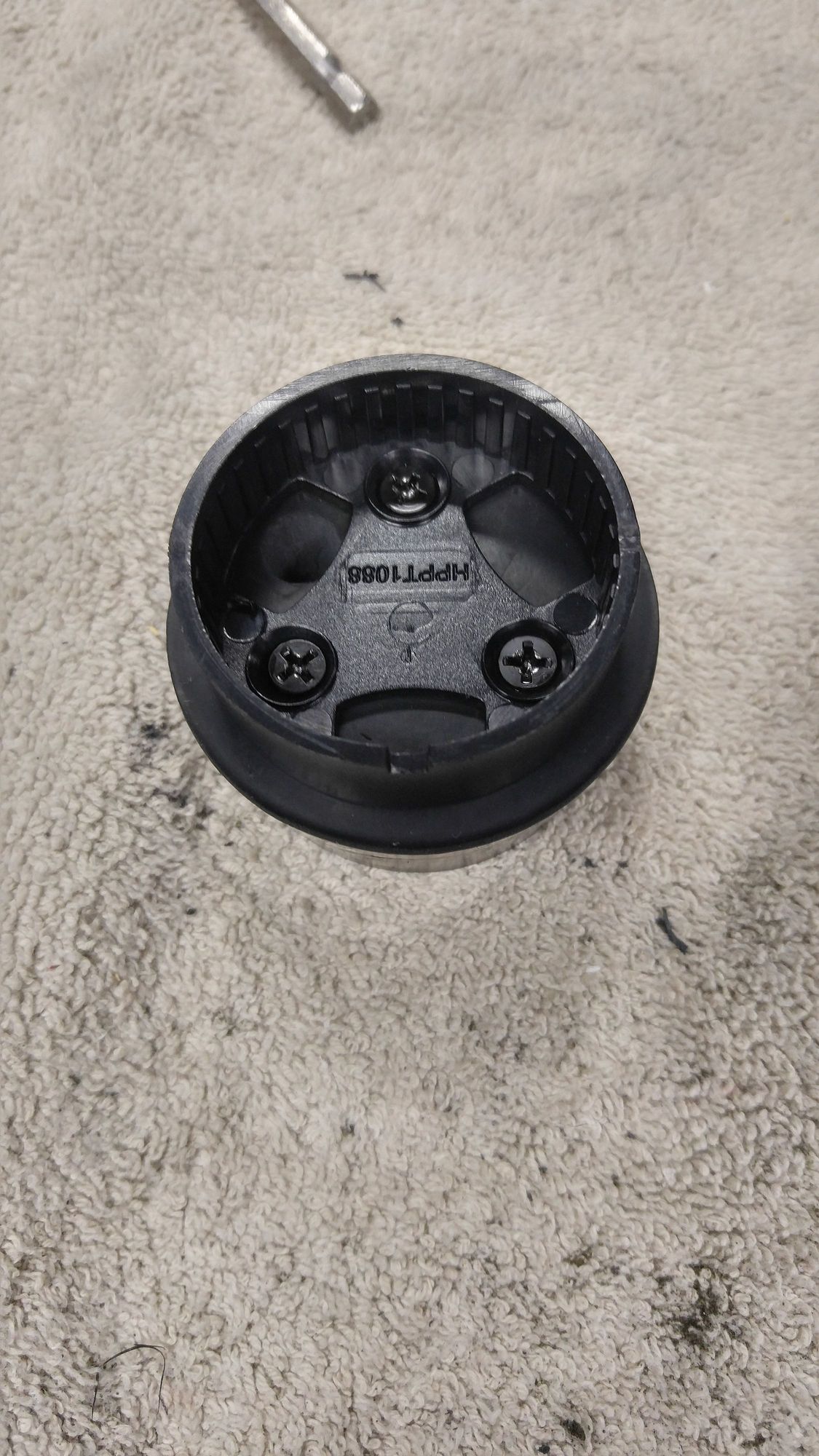 Top view of the mount screwed into the top of the rubber stopper. You can see the hole drilled through the stopper at about 10 o'clock for the tweeter wires to pass through.